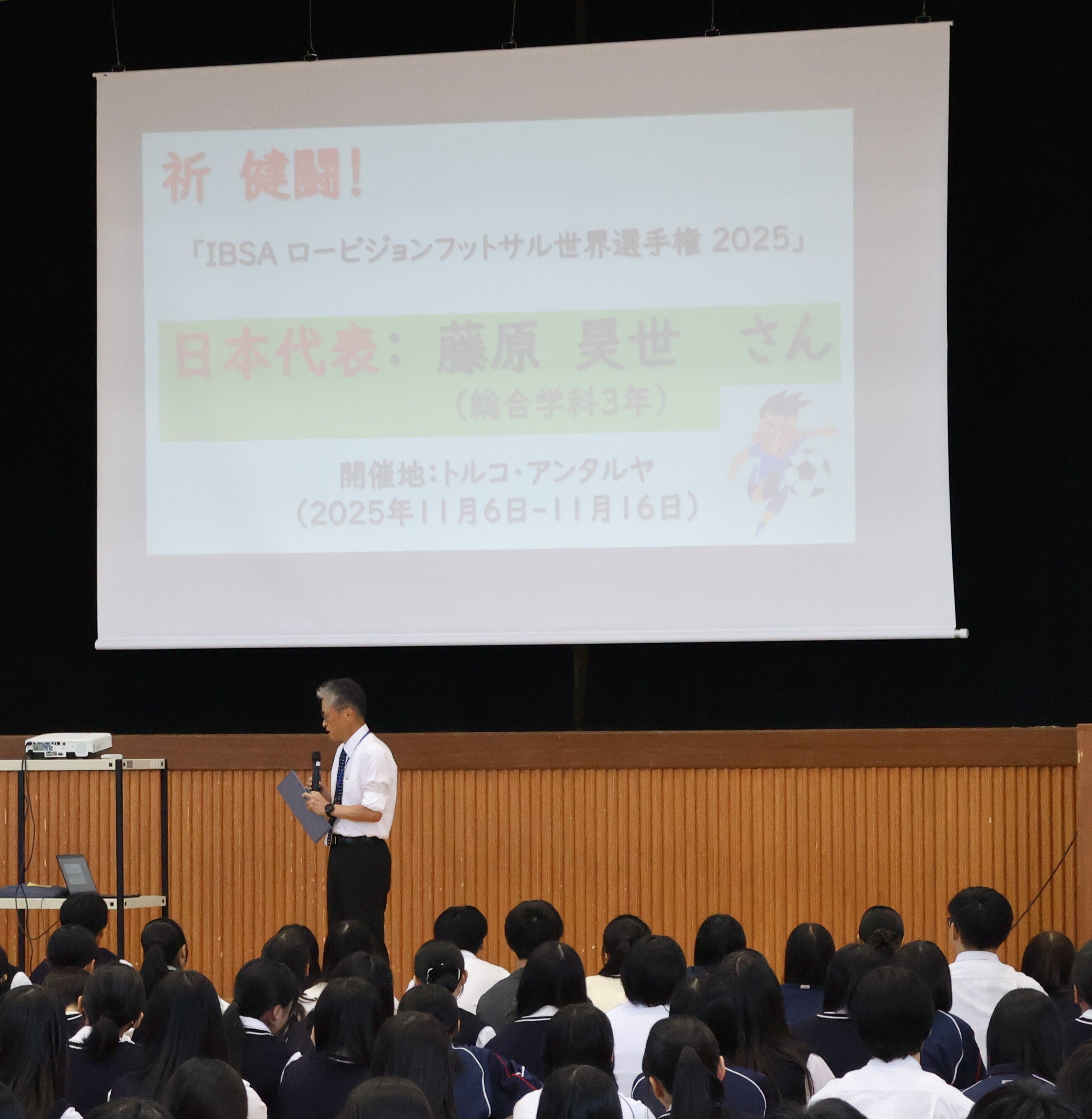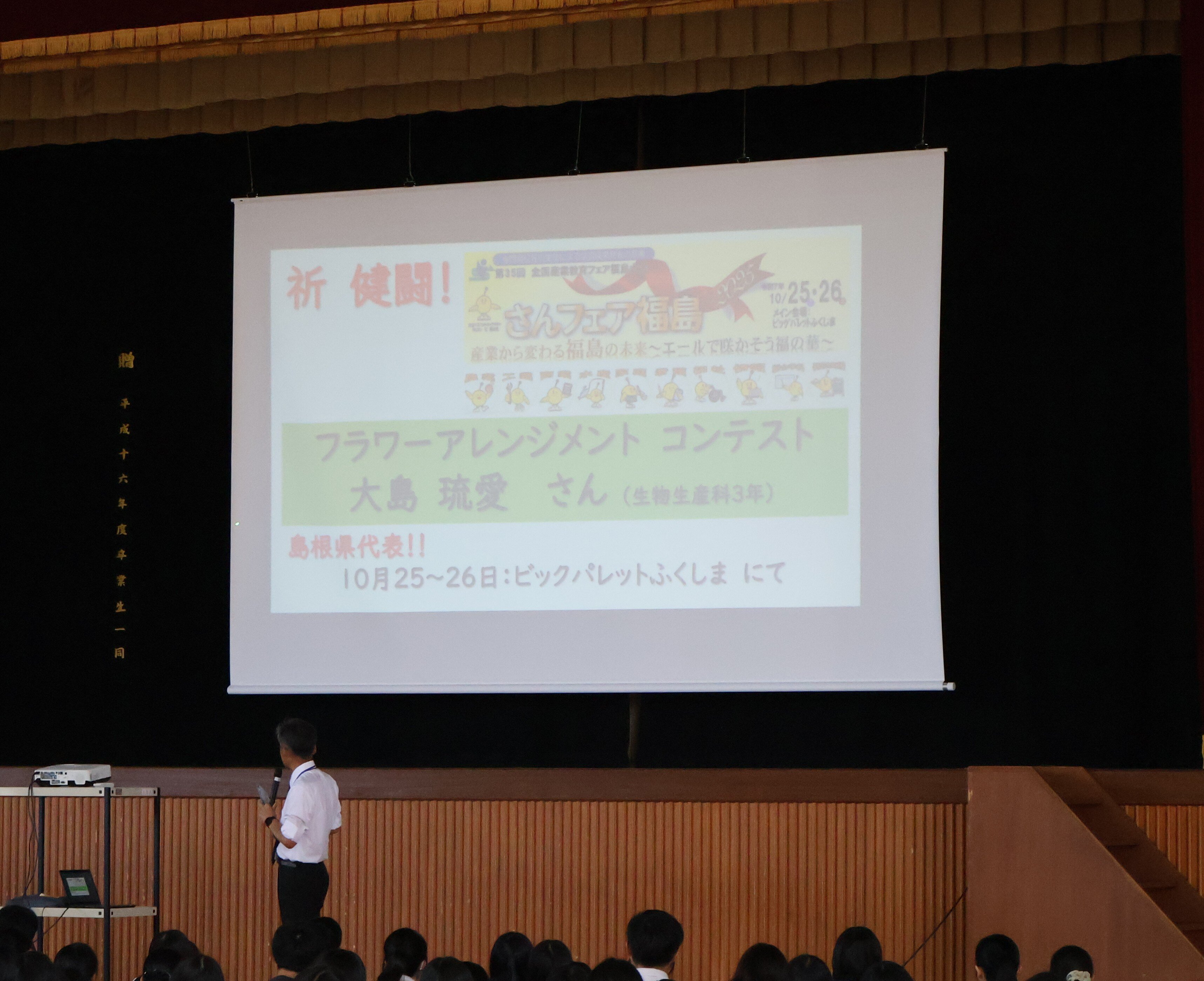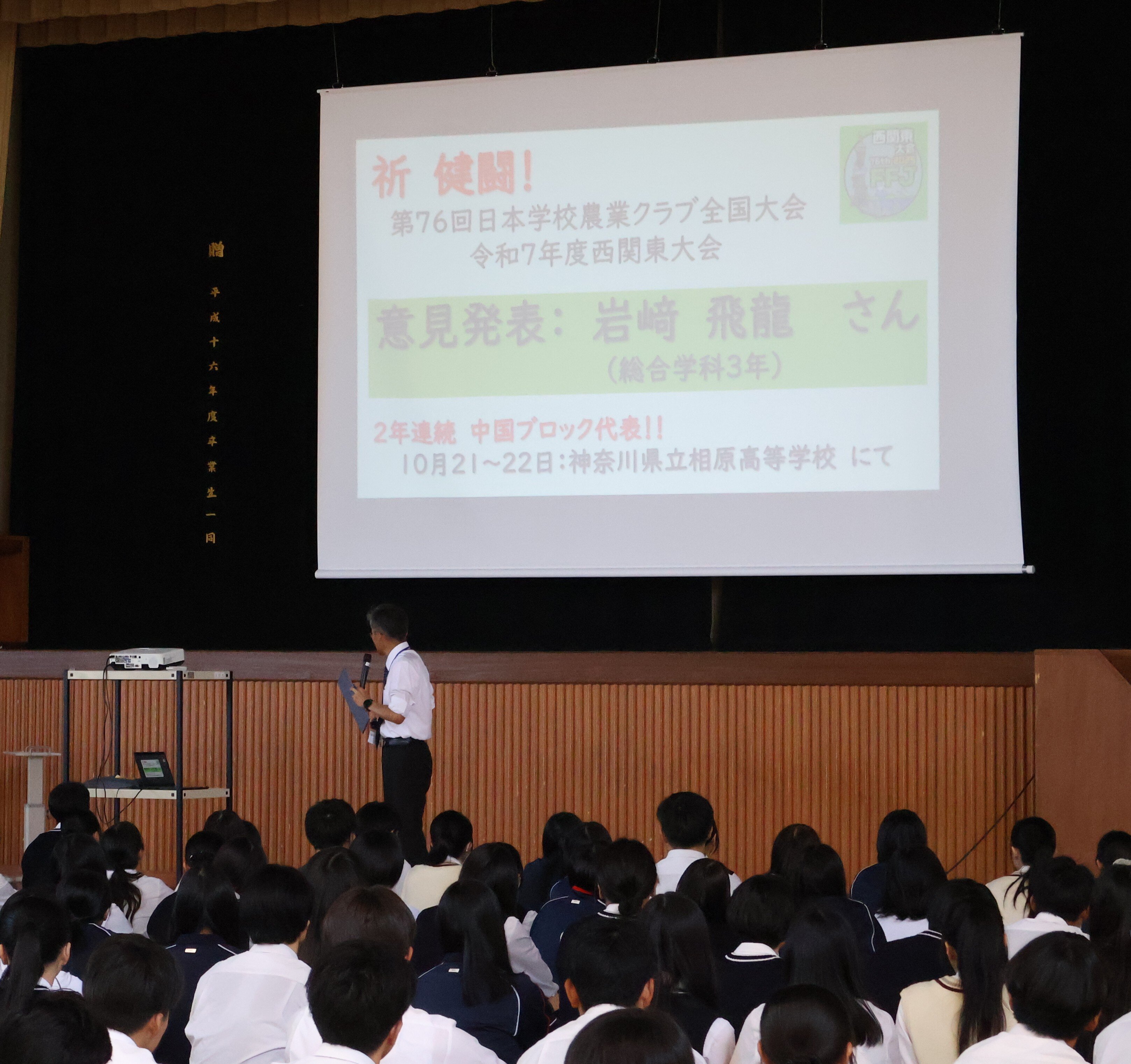 ロービジョンフットサル世界選手権2025(11月6日~16日にトルコ・アンタルヤにて開催)に出場する藤原昊正(総合学科3年)さん、農業クラブ全国大会(10月22日~23日に山梨県を中心に開催。意見発表会、鑑定競技会、代議員会に出場)に出場する皆さん、フラワーアレンジメントコンテスト(10月25日~26日に福島県で開催される全国産業教育フェアのなかで開催)に出場する大島琉愛(生物生産科3年)さんの壮行式を開催しました。農業クラブ全国大会では、意見発表大会において岩崎飛龍(総合学科3年)さんは2年連続で中国地区代表として出場します。松農生がんばれ!!