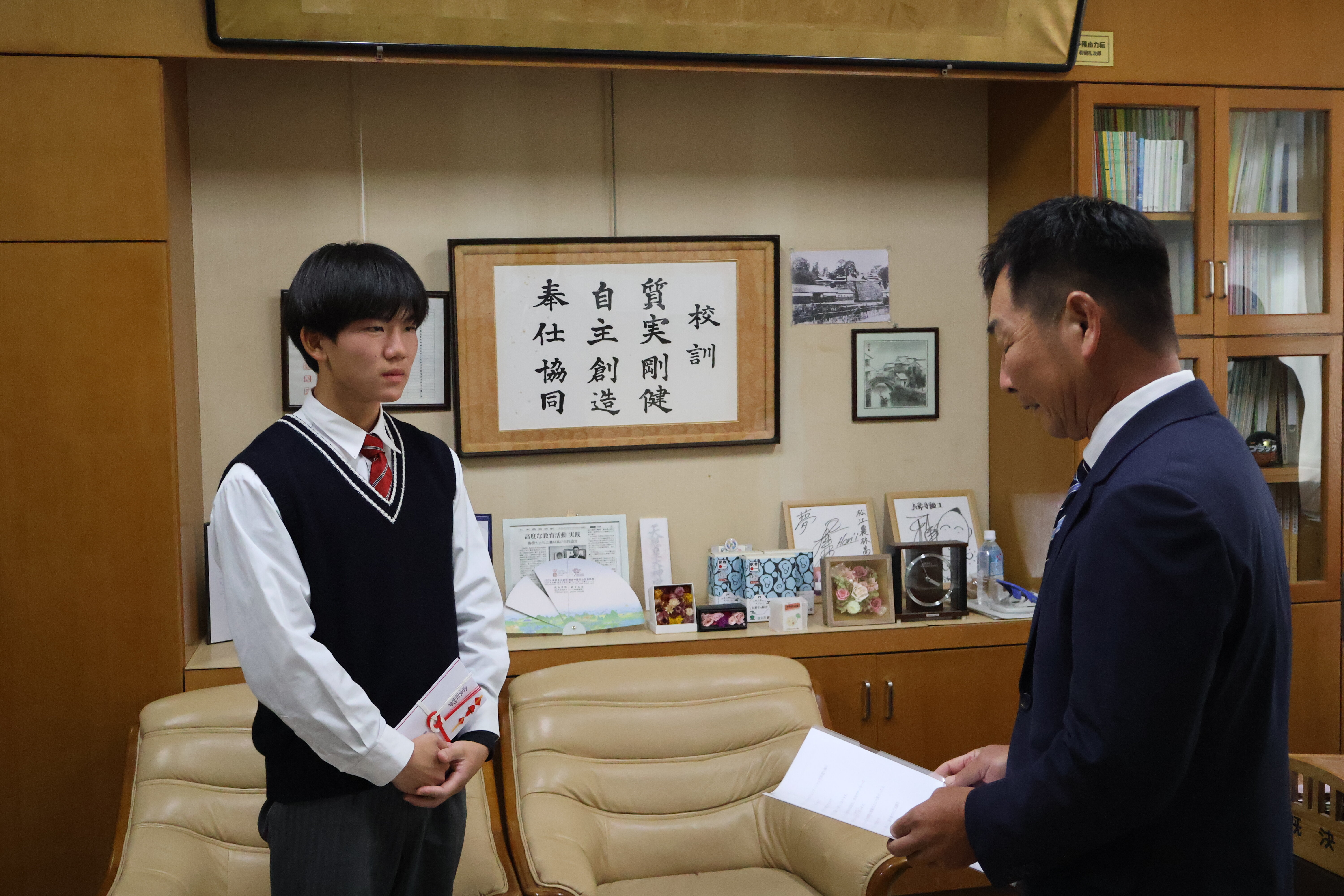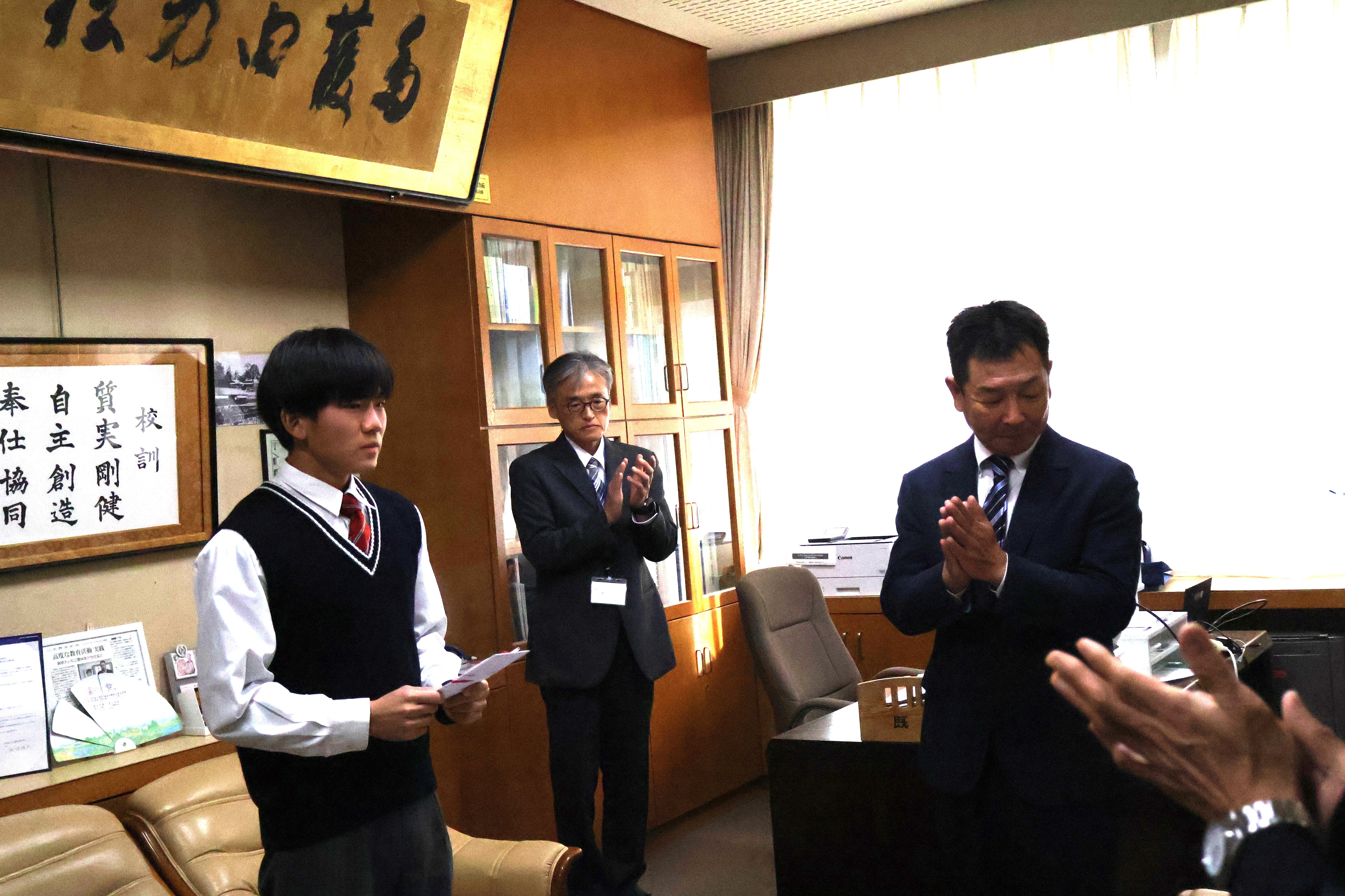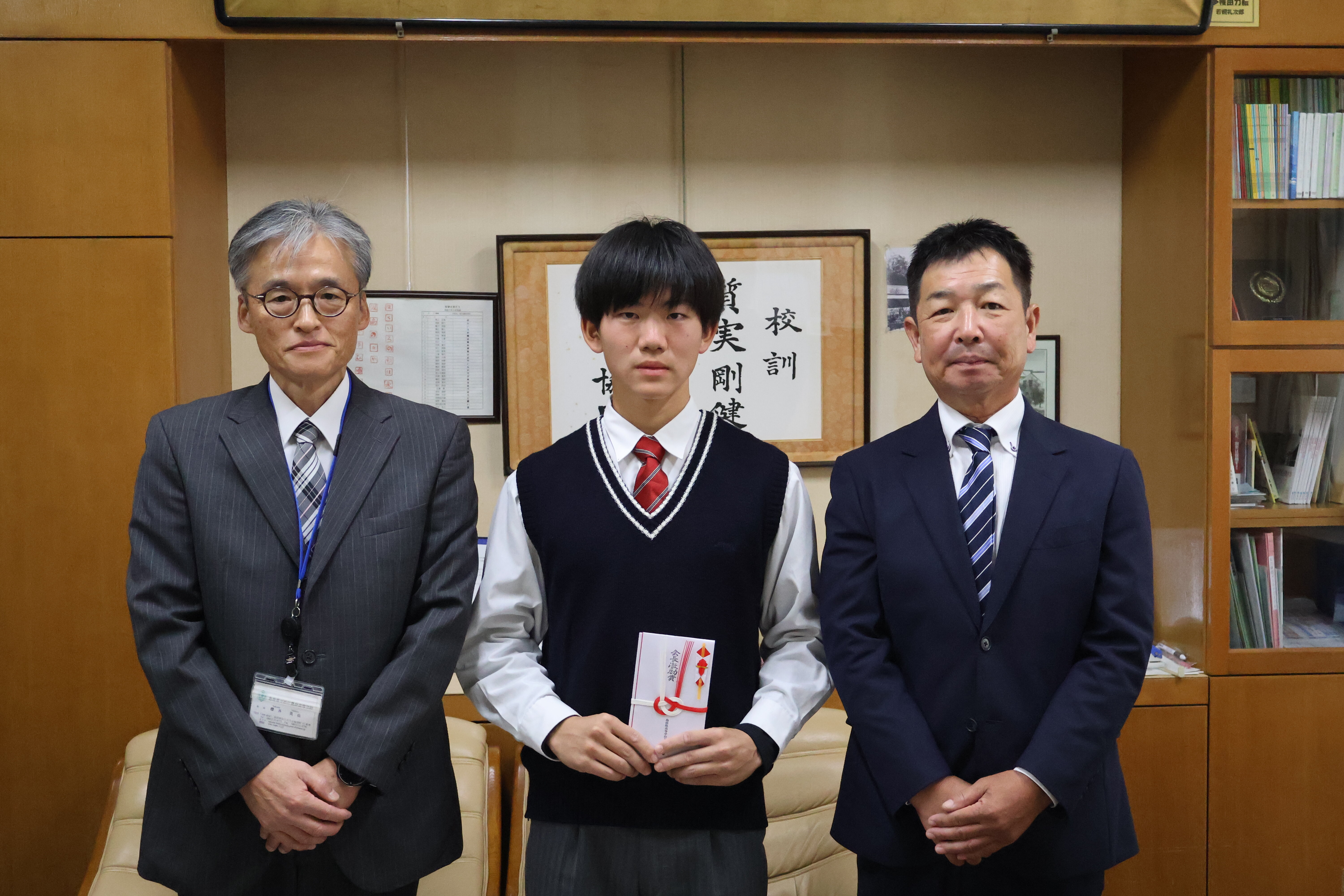 IBSAロービジョンフットサル世界選手権2025に出場する藤原昊世さんへ島根県高等学校PTA連合会より激励費をいただきました。激励費贈呈の後、藤原さんより力強い挨拶がありました。PTA連合会様、ありがとうございました。