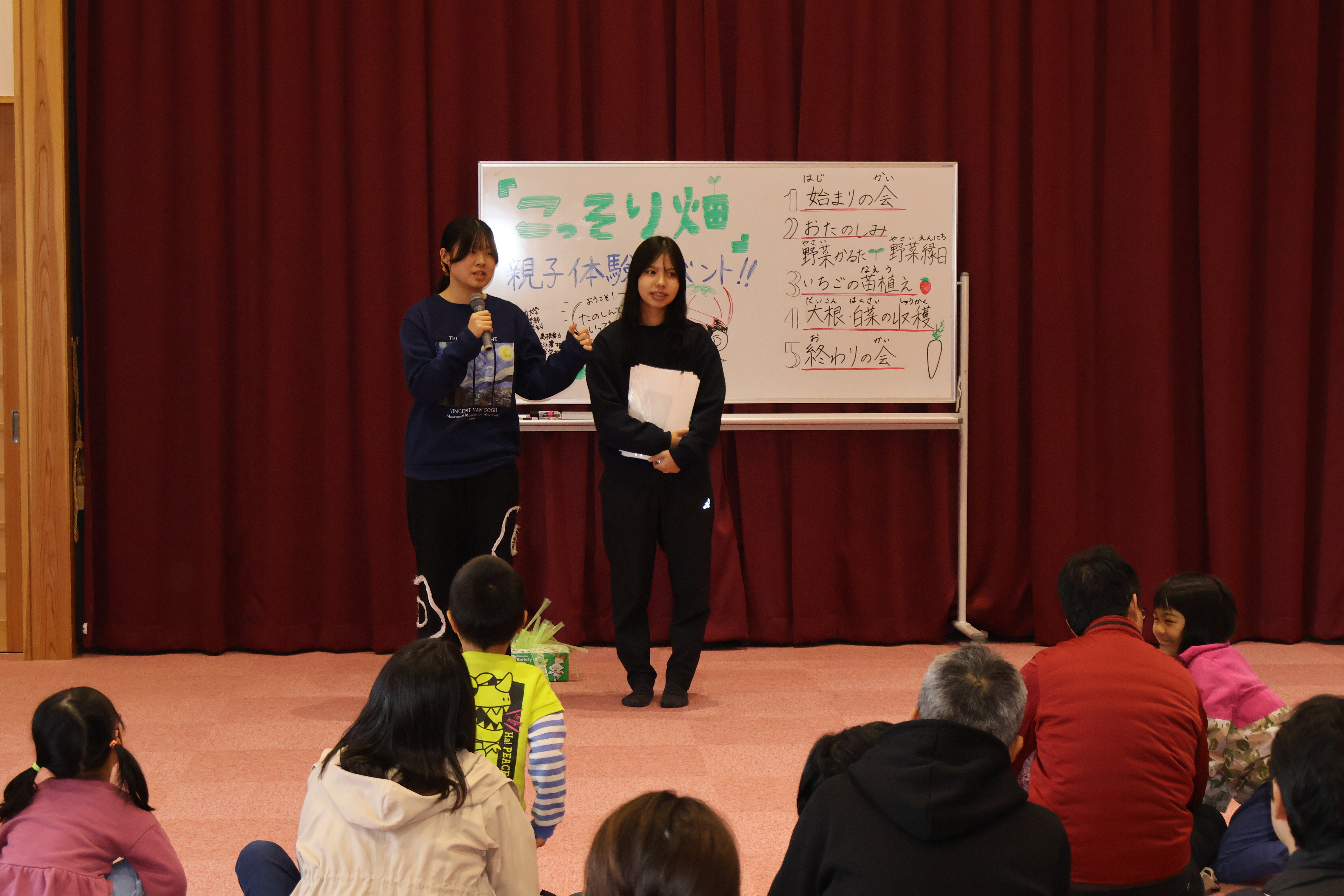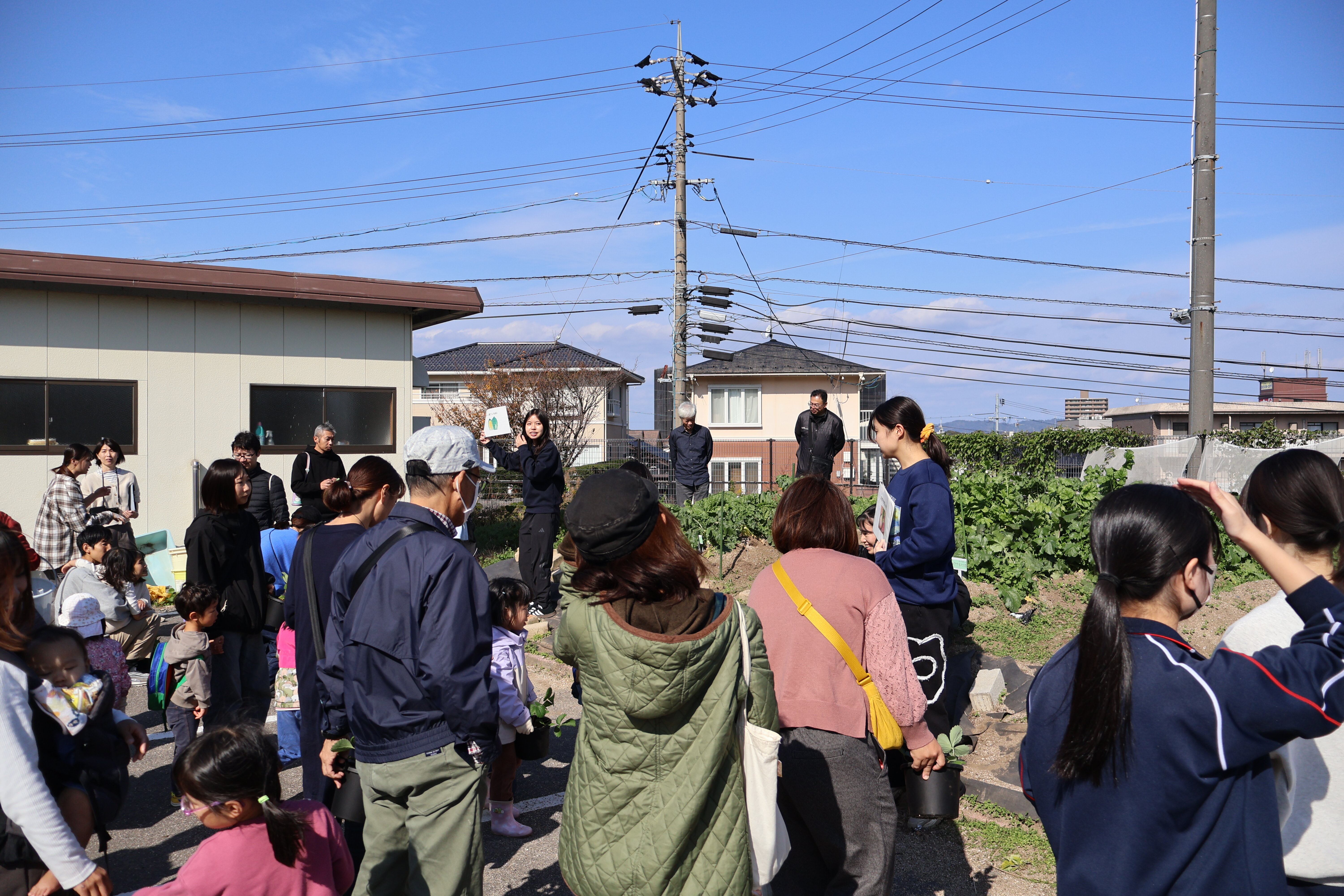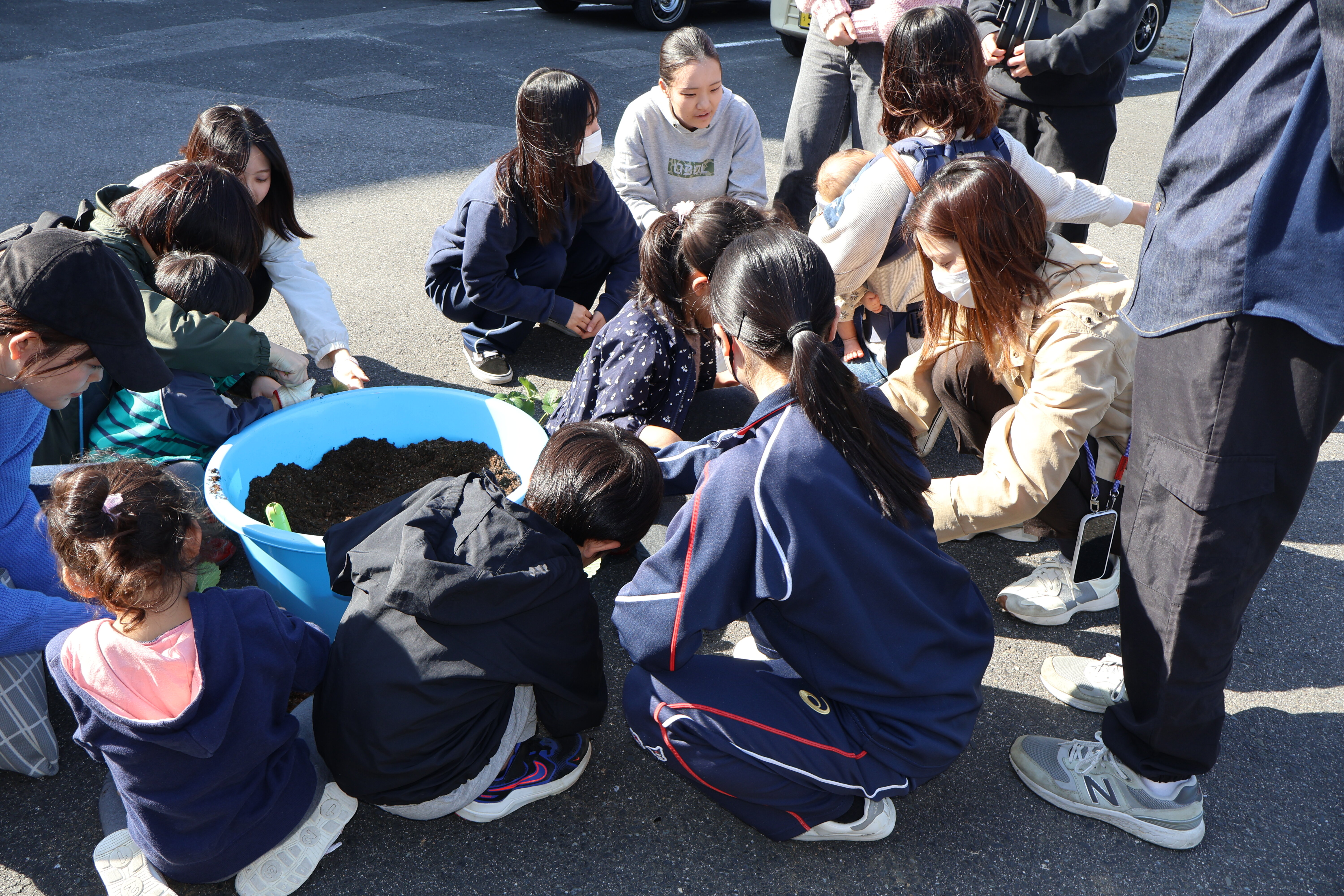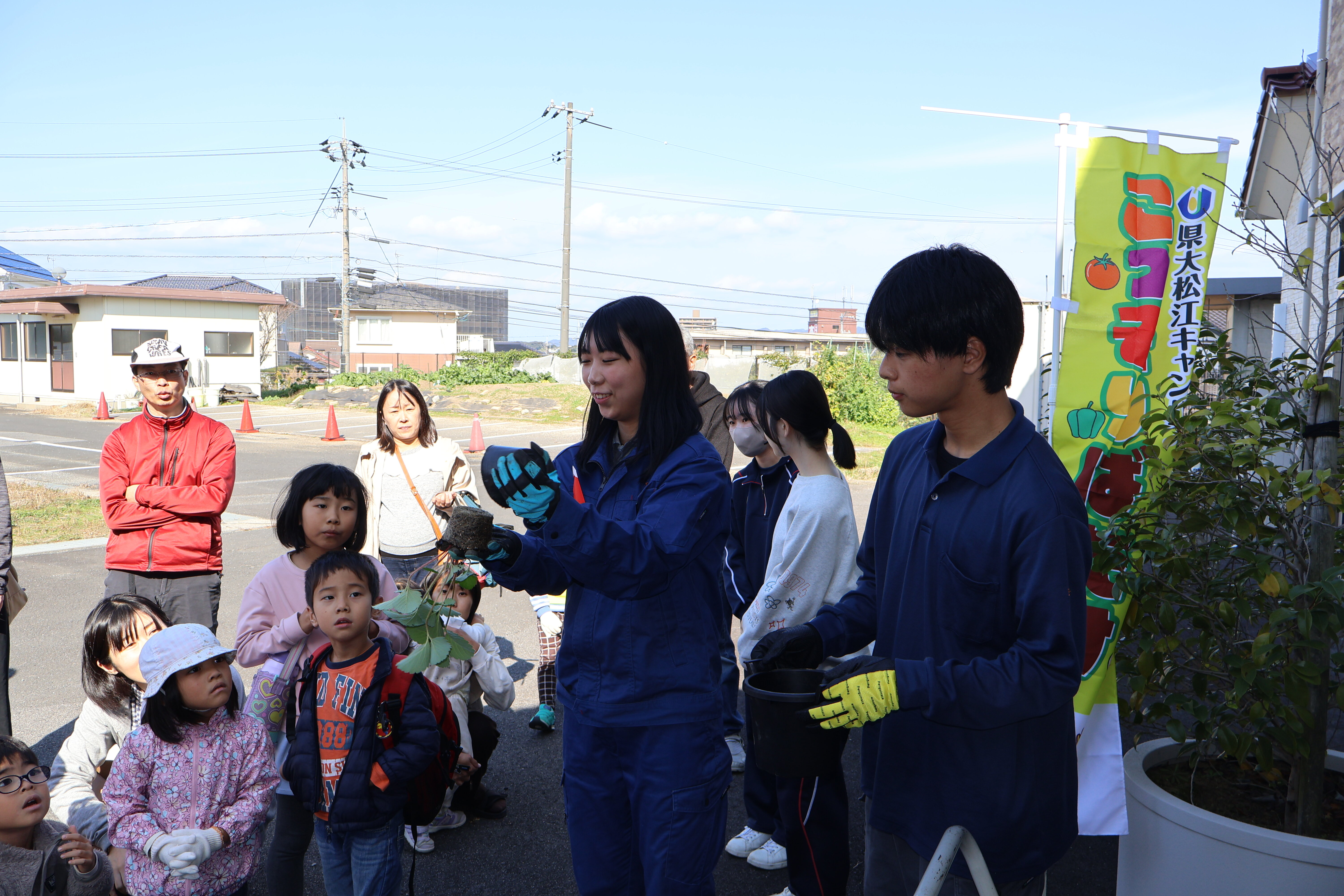 島根県立大学松江キャンパス保育学科との交流を年間を通して行っています。この日は、一年間の交流のまとめとして、県立大学松江キャンパスに地域の子どもたちに来てもらい交流を行いました。将来保育士をめざす生徒が、学生さん、小さい子どもたちと交流することは大変に有意義です。松江農林高校で栽培したイチゴを持って帰ってもらったり、生徒が種をまいたダイコン、ハクサイを収穫し、「わぁー、おおきい!」ととても喜んでもらいました。