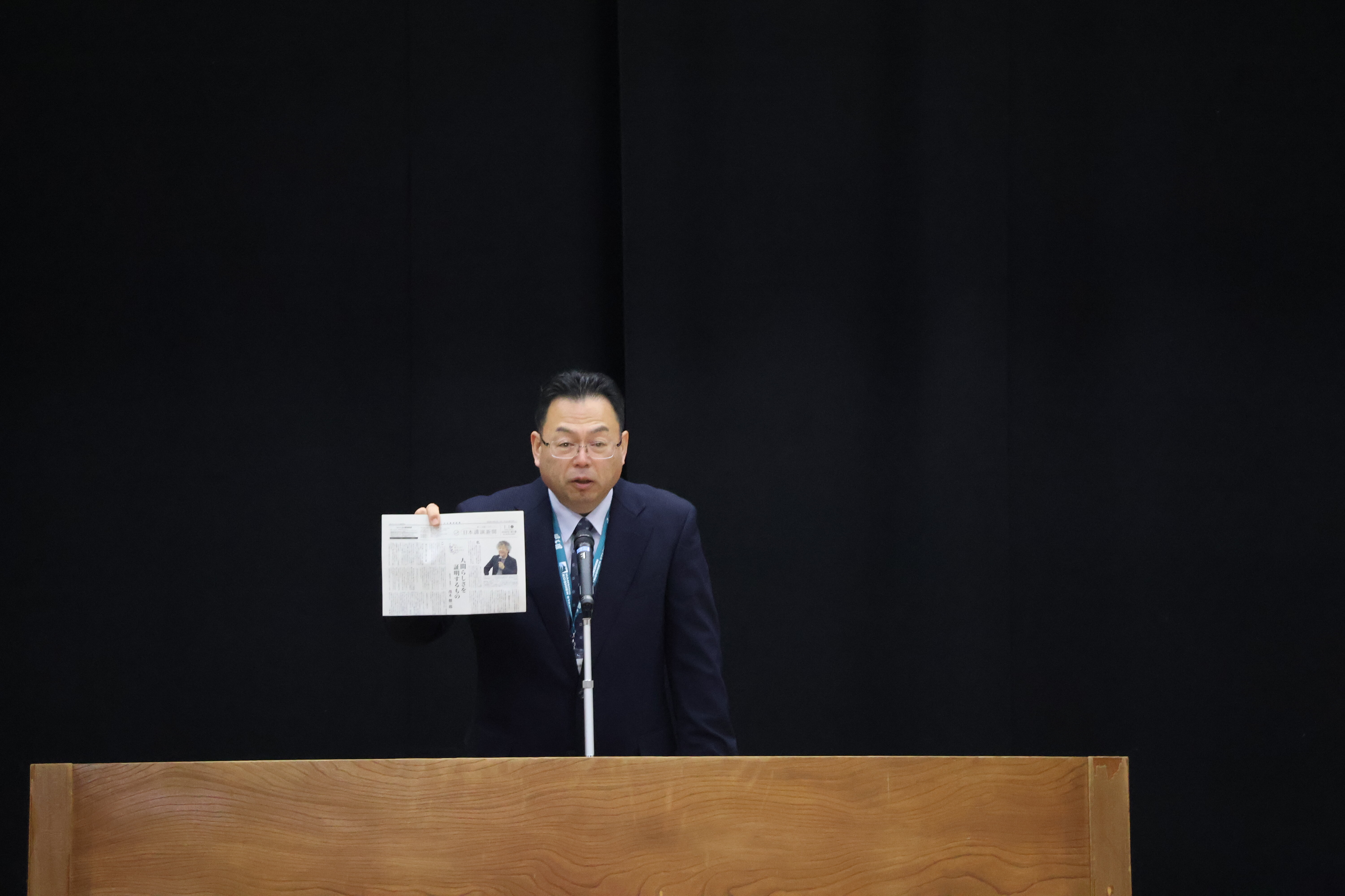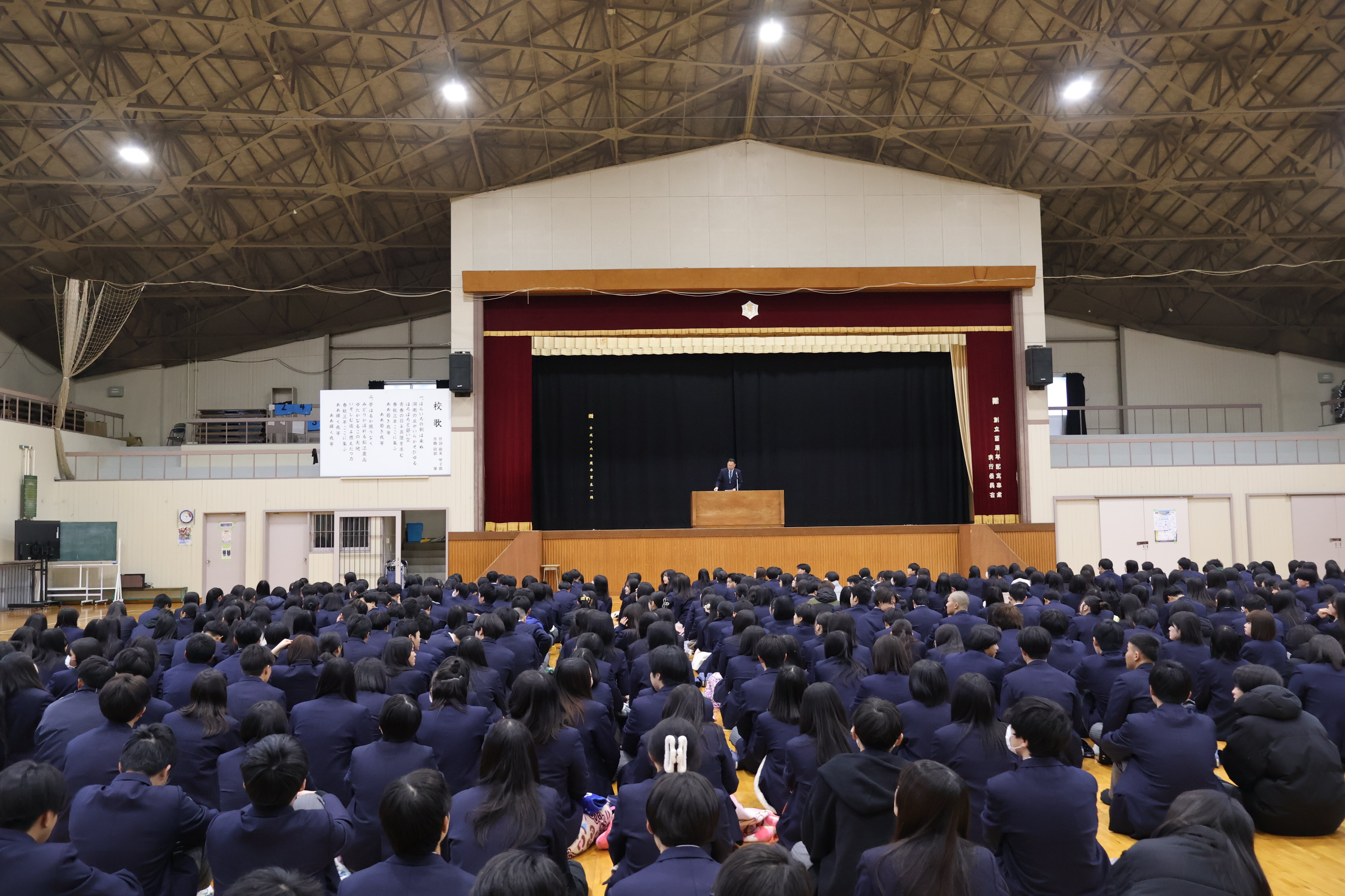 イベント カテゴリ: 【クラウドファンディング】 いじめ防止基本方針 お知らせ イベント グランドデザイン 中学生の皆様へ 収穫祭 各種支援金・大阪学生会館 各種証明書、他 図書館 学校経営方針 授業風景 特別支援教育 行事予定 進路指導部 部活動 2026. 01.08 3学期始業式、表彰式 3学期始業式、表彰式を行いました。始業式では、板垣校長先生から2、3の新聞を紹介しながら「新聞を読もう」との話がありました。また、「3学期は各学年ともまとめの学期です。しっかりとまとめよう。」との話がありました。 始業式 表彰式 前に戻る