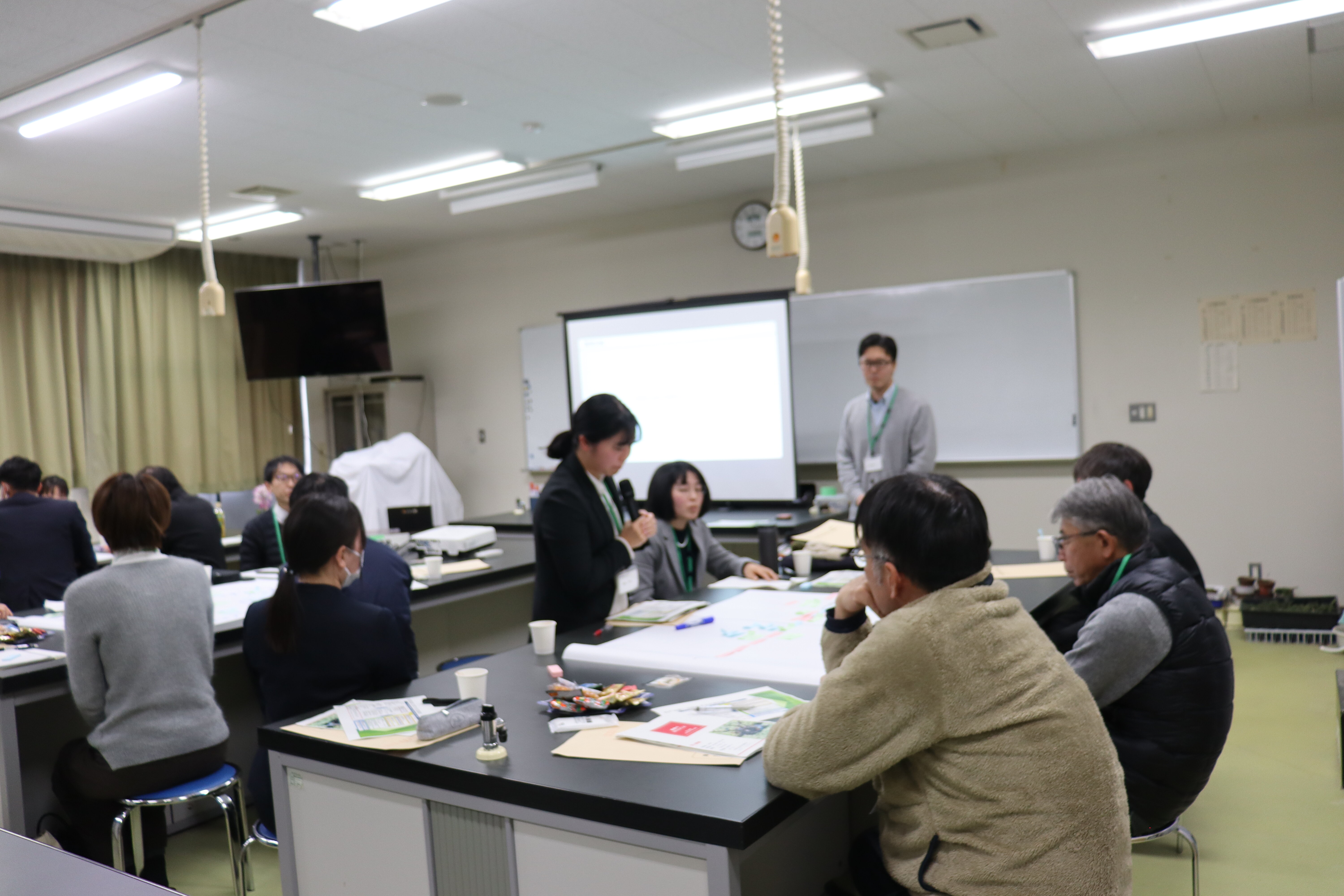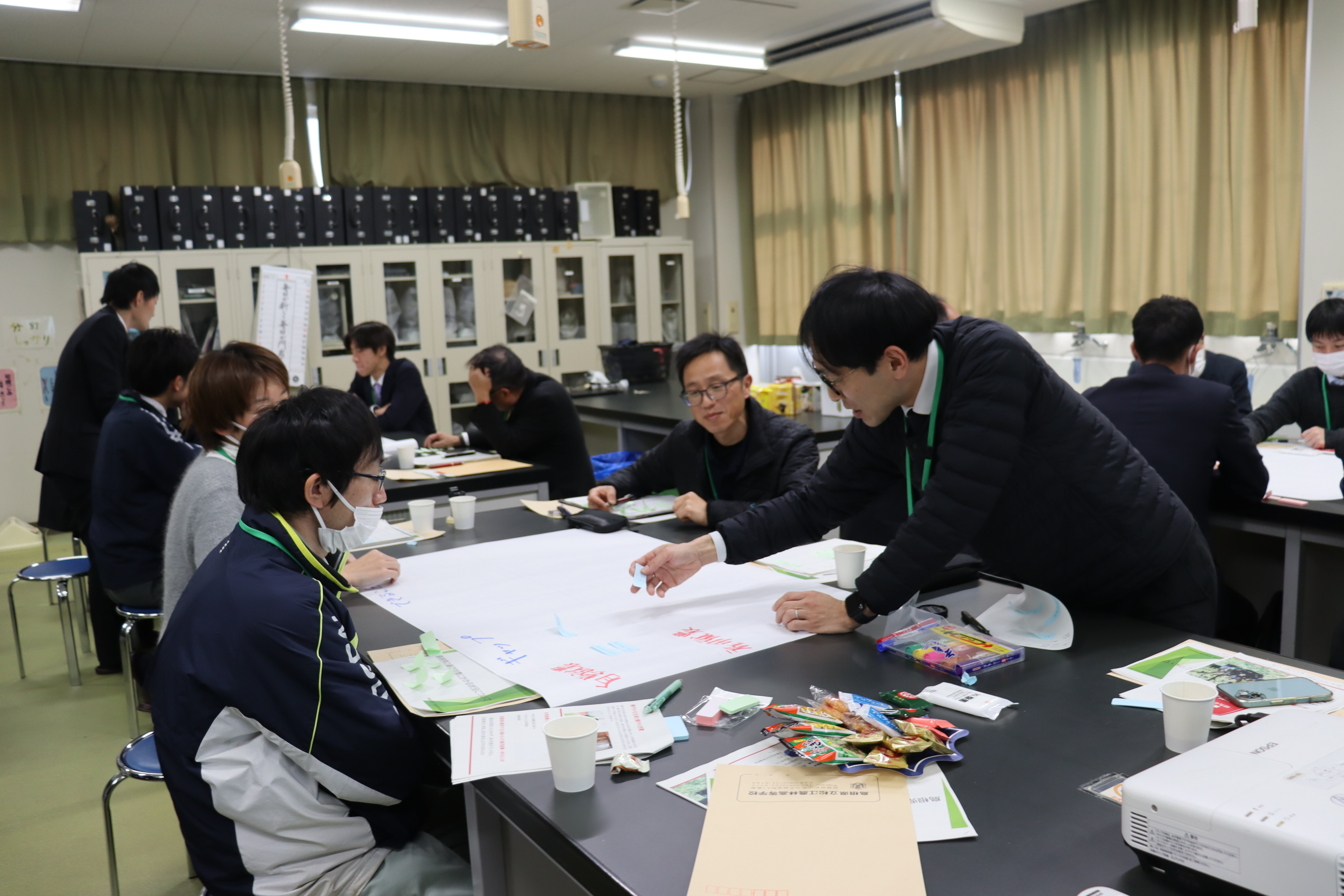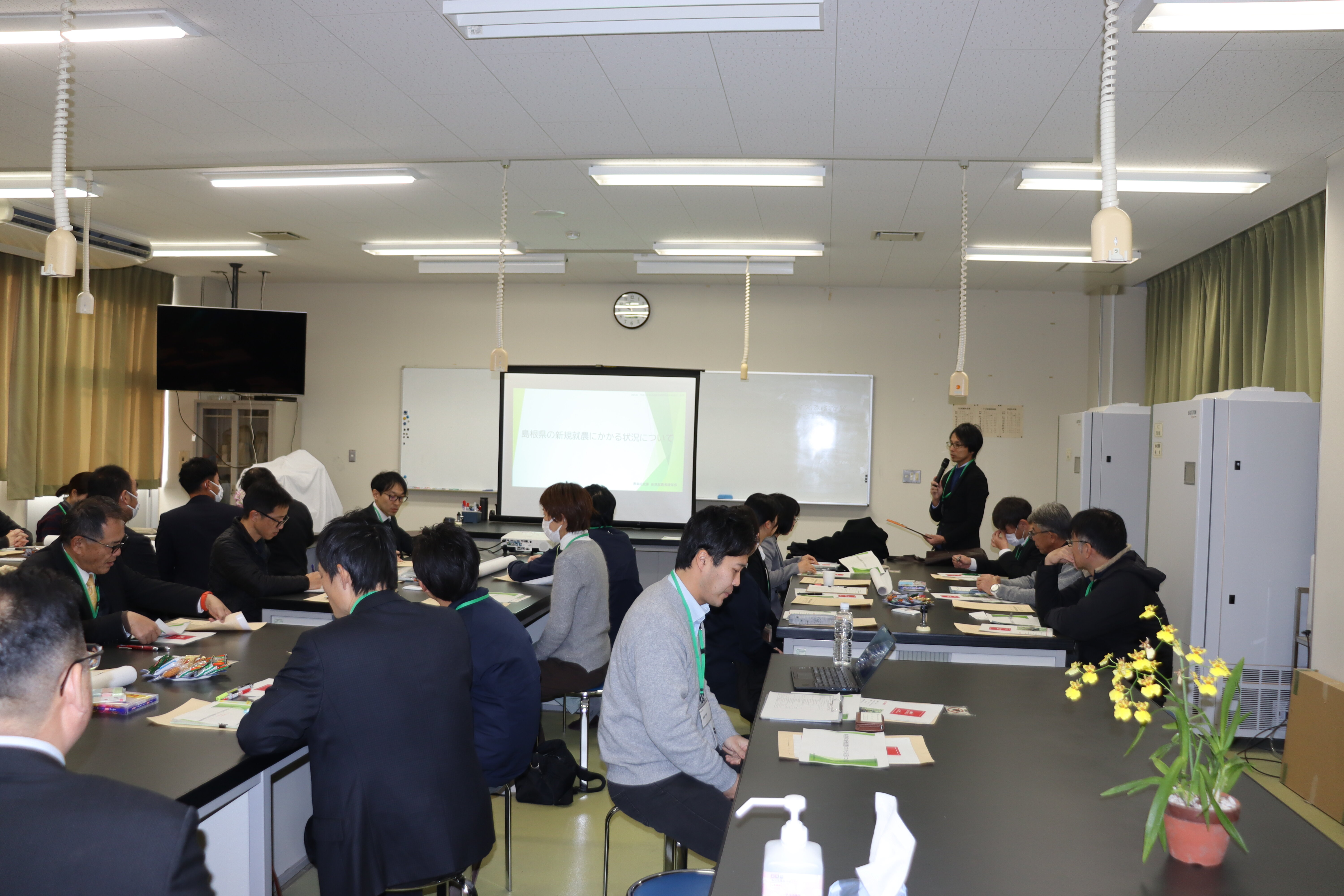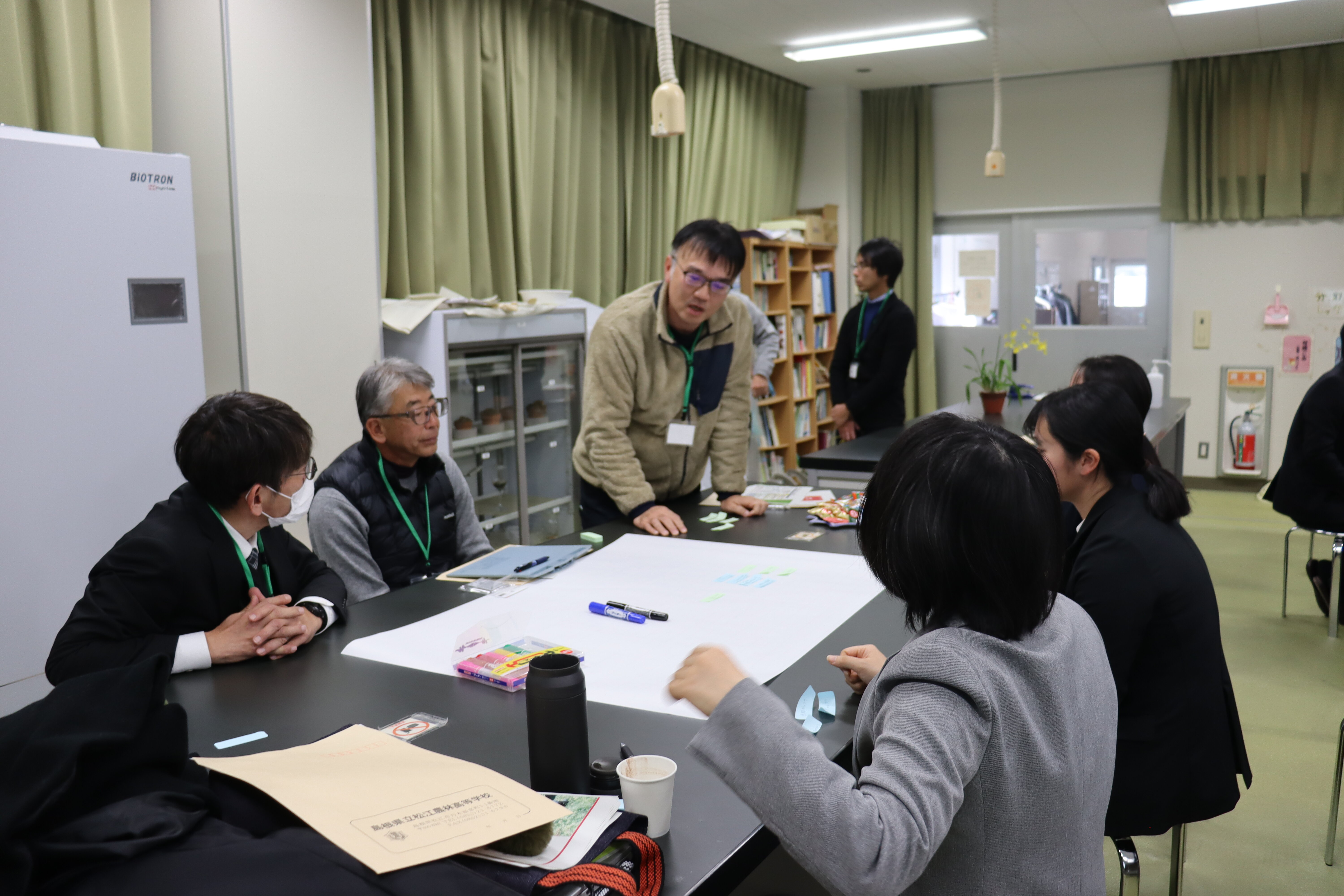島根県の農業高校の先生方と島根県職員で農業の就農を担当しておられる職員の皆さん、農林大学校の先生方、農業者の方を交えて研修会を行いました。県庁農業経営課から新規就農の状況についての話、松江市の農業者の方からの話の後、農林大学校の先生が司会をし、①高校在学時と就農時で感じるギャップ、②農業で働く力や意識を養うためにできることをグループに分かれて話し合いました。グループでは、意見を考える、発表、模造紙に付せんを貼ってまとめる、全体発表し、模造紙をボードに貼って意見を共有するという時間でした。島根の農業後継者について農業関係の県職員と農業教員がともに考える貴重な時間でした。