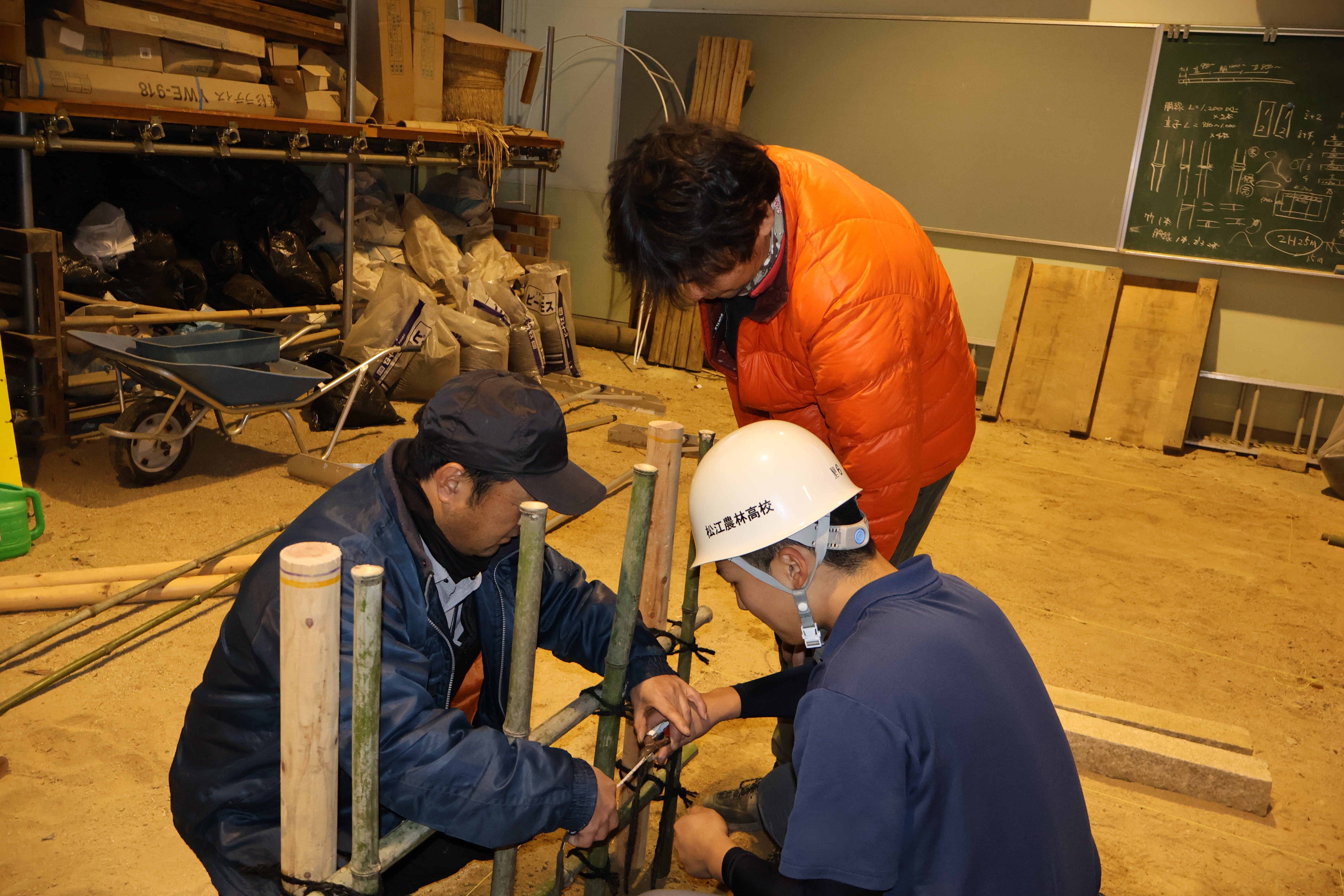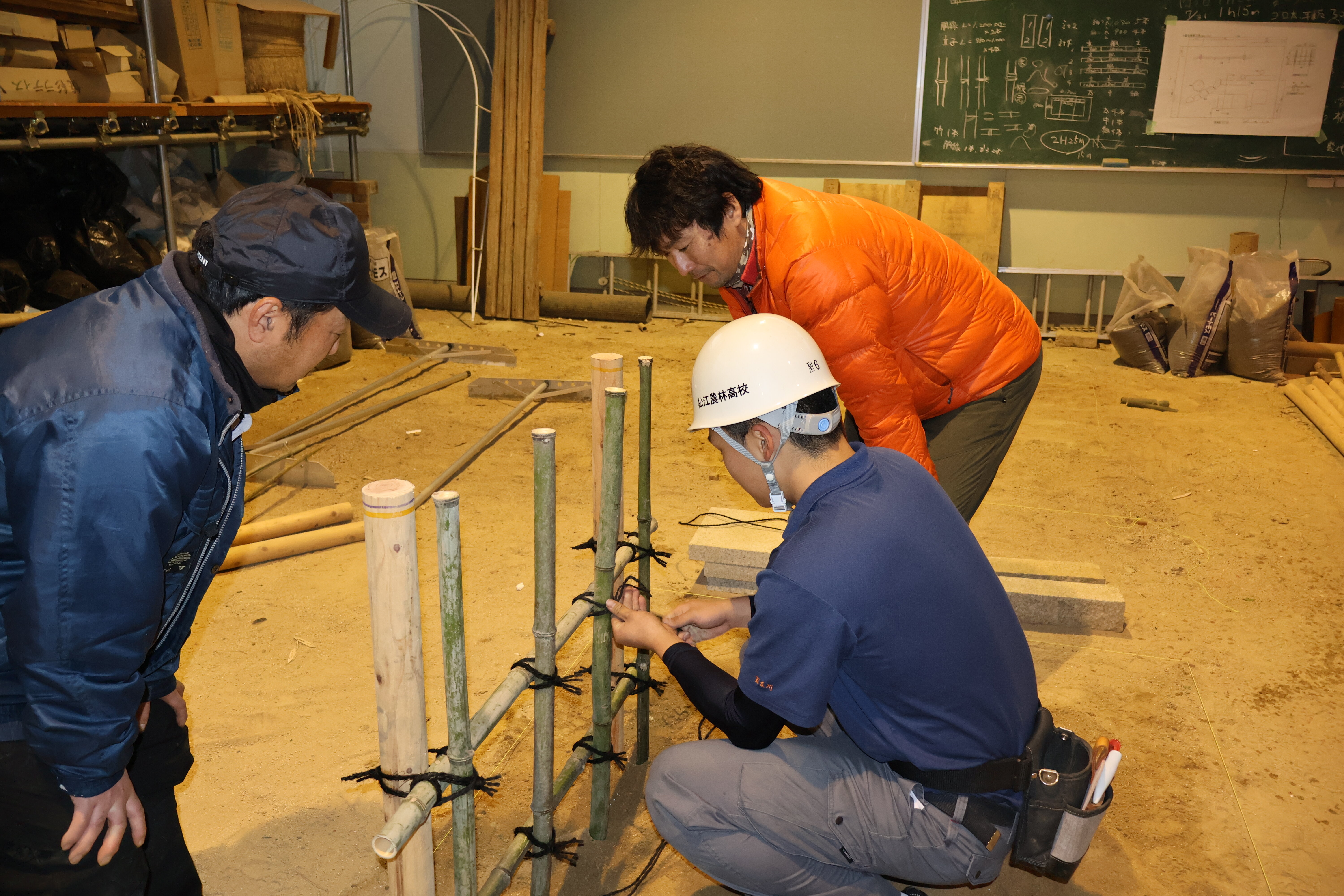 校内ではさまざまな資格を取得するための学習をしています。環境土木科では造園技能検定に向けて勉強しています。この日は、竹を格子目状に編む方法、竹を結ぶ方法を造園業者の方に直接手取り足取り指導していただきました。業者さんは次の世代の造園業に携わる人を養成しようと一生懸命に指導していていただいています。ありがとうございます。