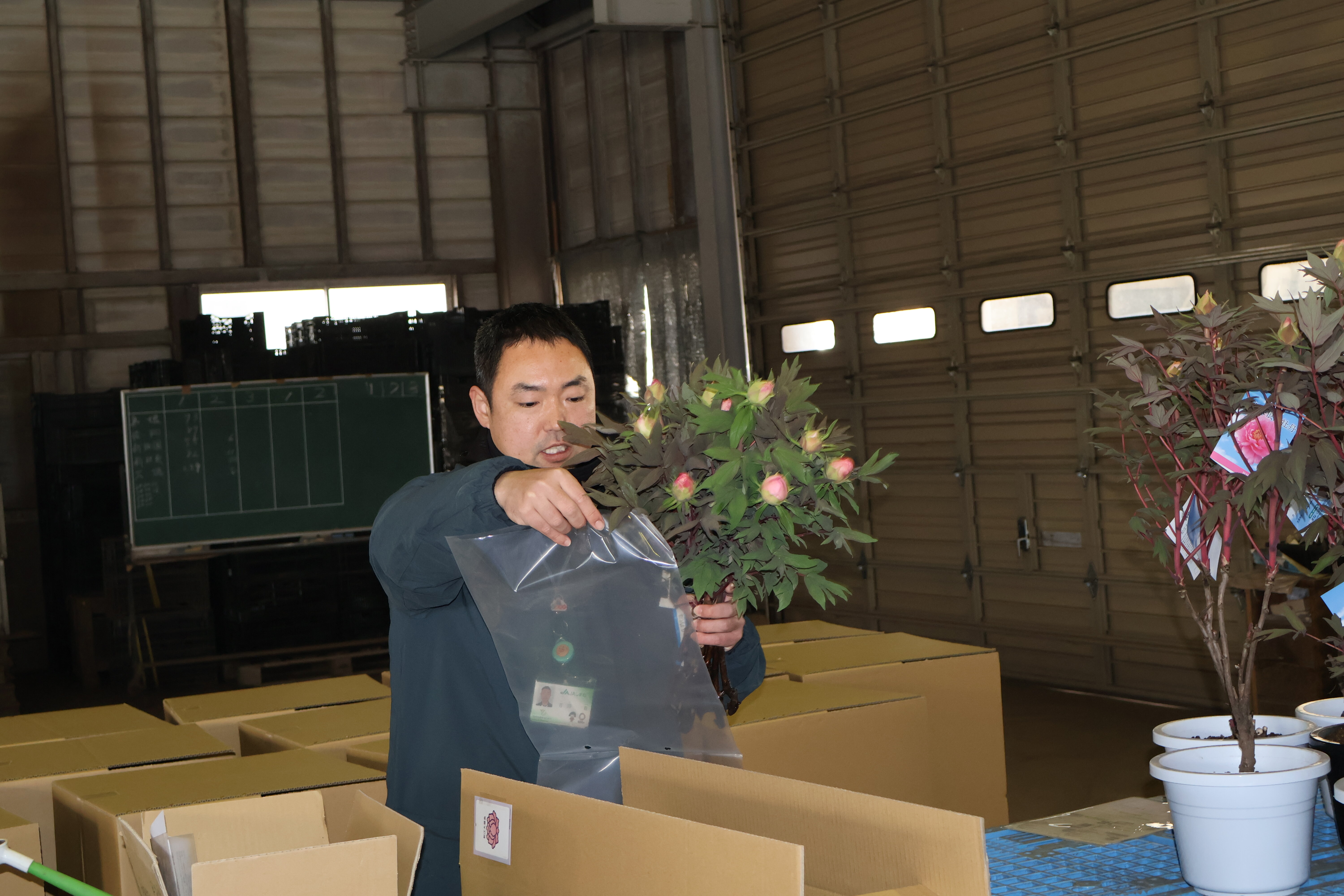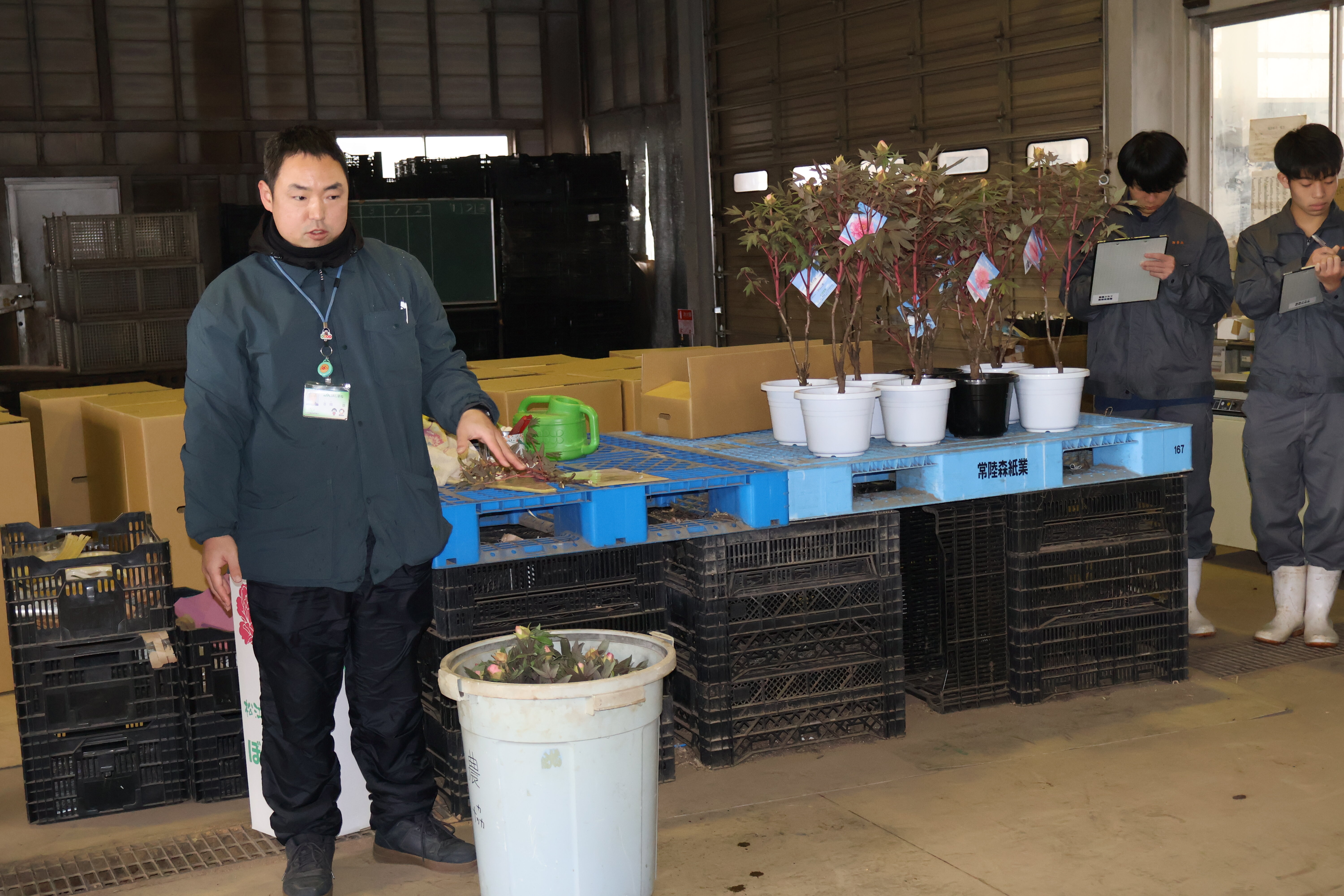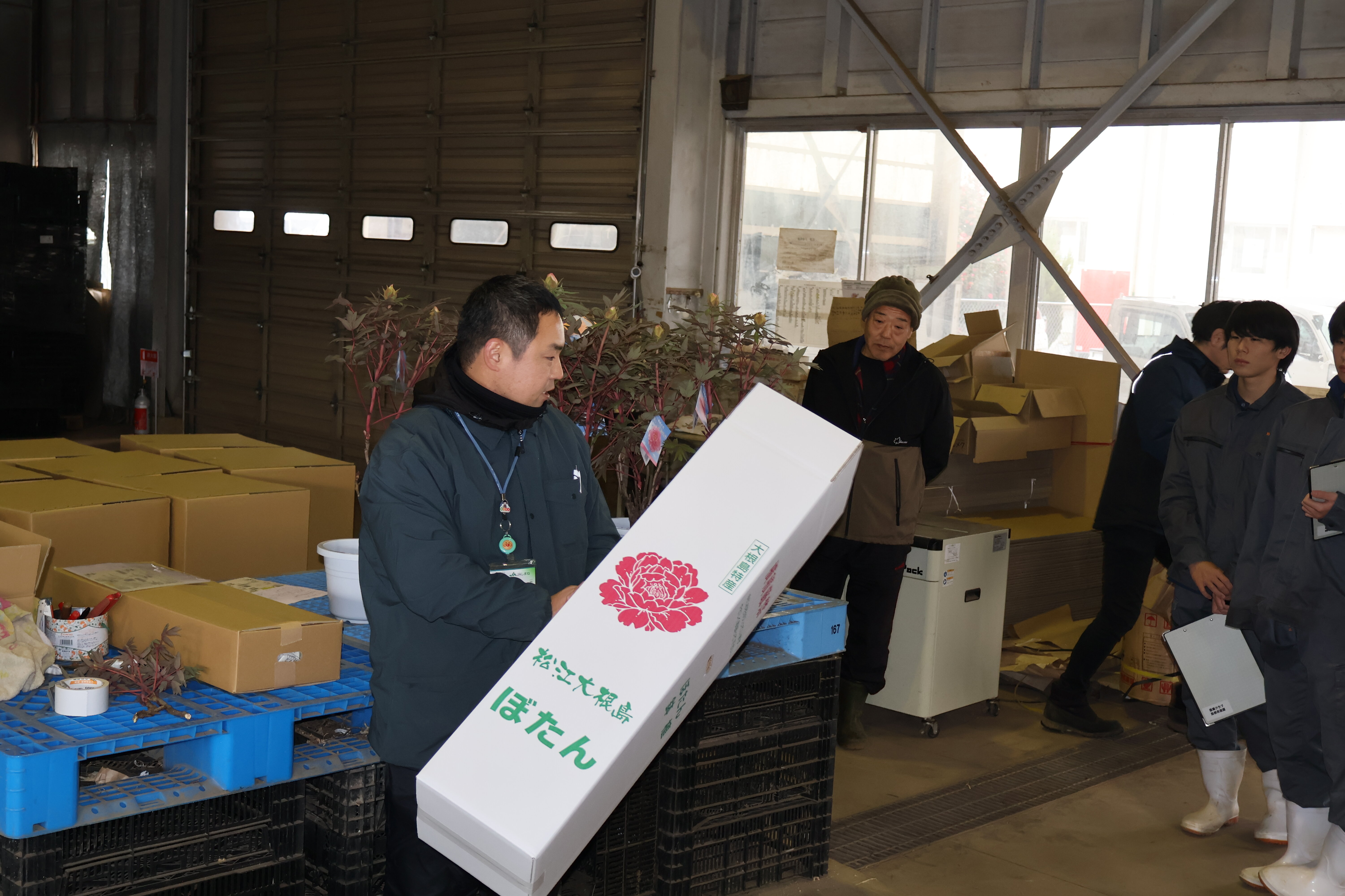 生物生産科です。草花コース、植物バイオコースの人たちが八束町でボタンの出荷の準備の様子を見学しました。八束町のボタンの生産は日本一を誇っています。ボタンを切り花、鉢花として全国各地、海外へ出荷するさいのポイントを勉強しました。無事トラックが市場へ到着できるようそれぞれクッション材などを入れていることなどを実演を交えて教えていただきました。ボタンの本来の開花は5月ですが、早く出荷するための工夫などもあわせて教えていただきました。生産者の思いが消費者の皆さんに伝わるようとてもていねいな仕事を心がけていることを教えていただきました。農家さん、JAの皆様、県・市の担当者の皆様ありがとうございました。