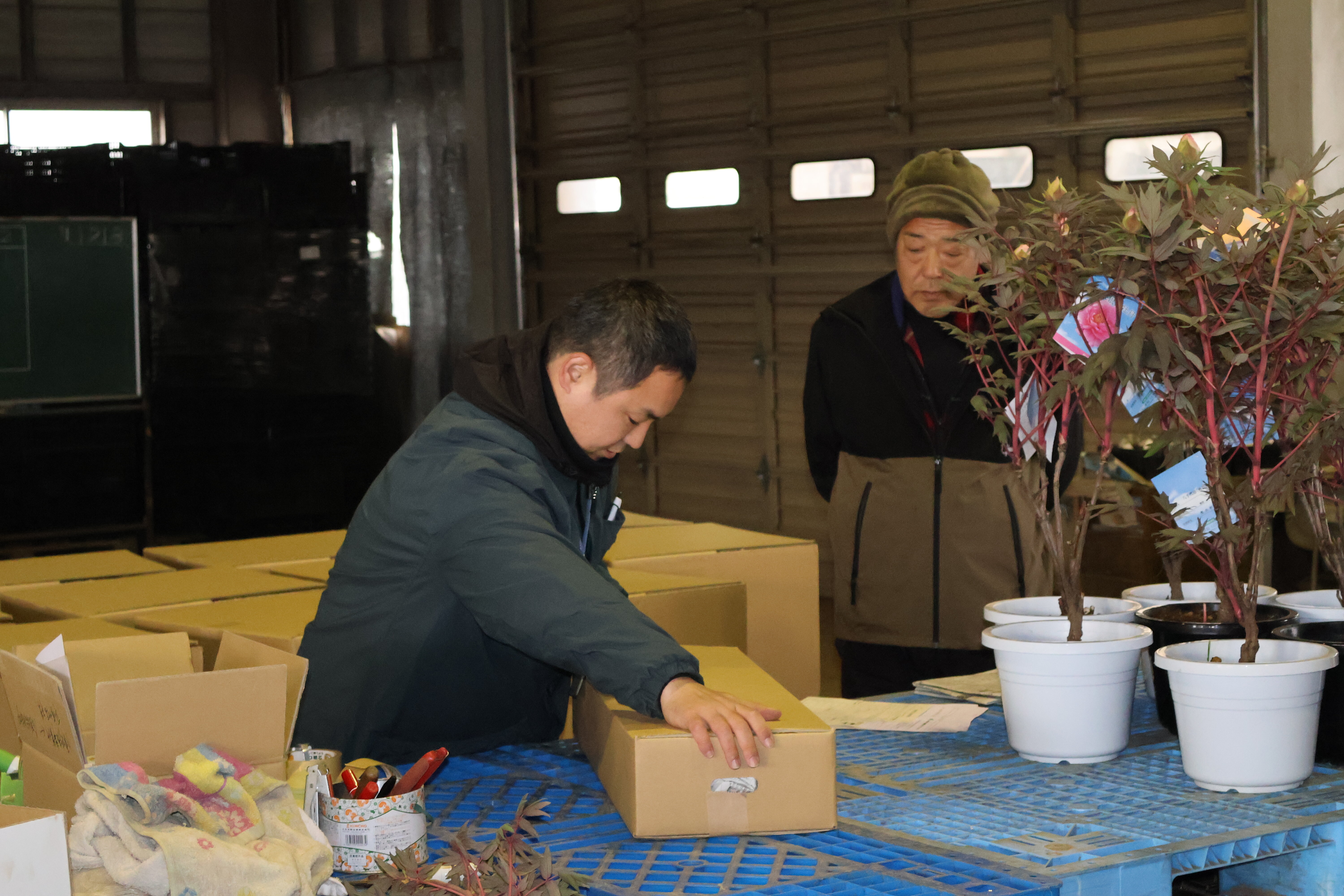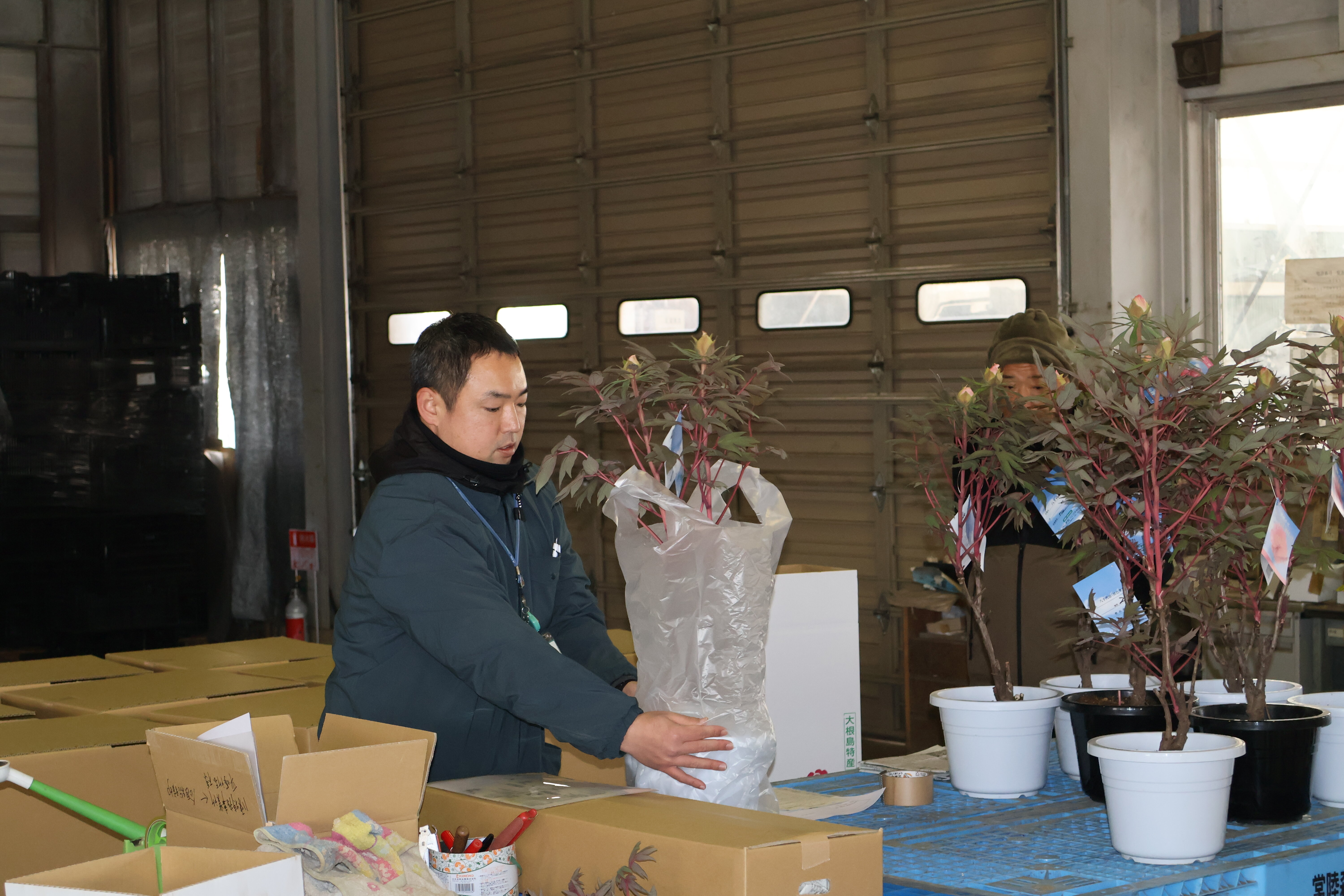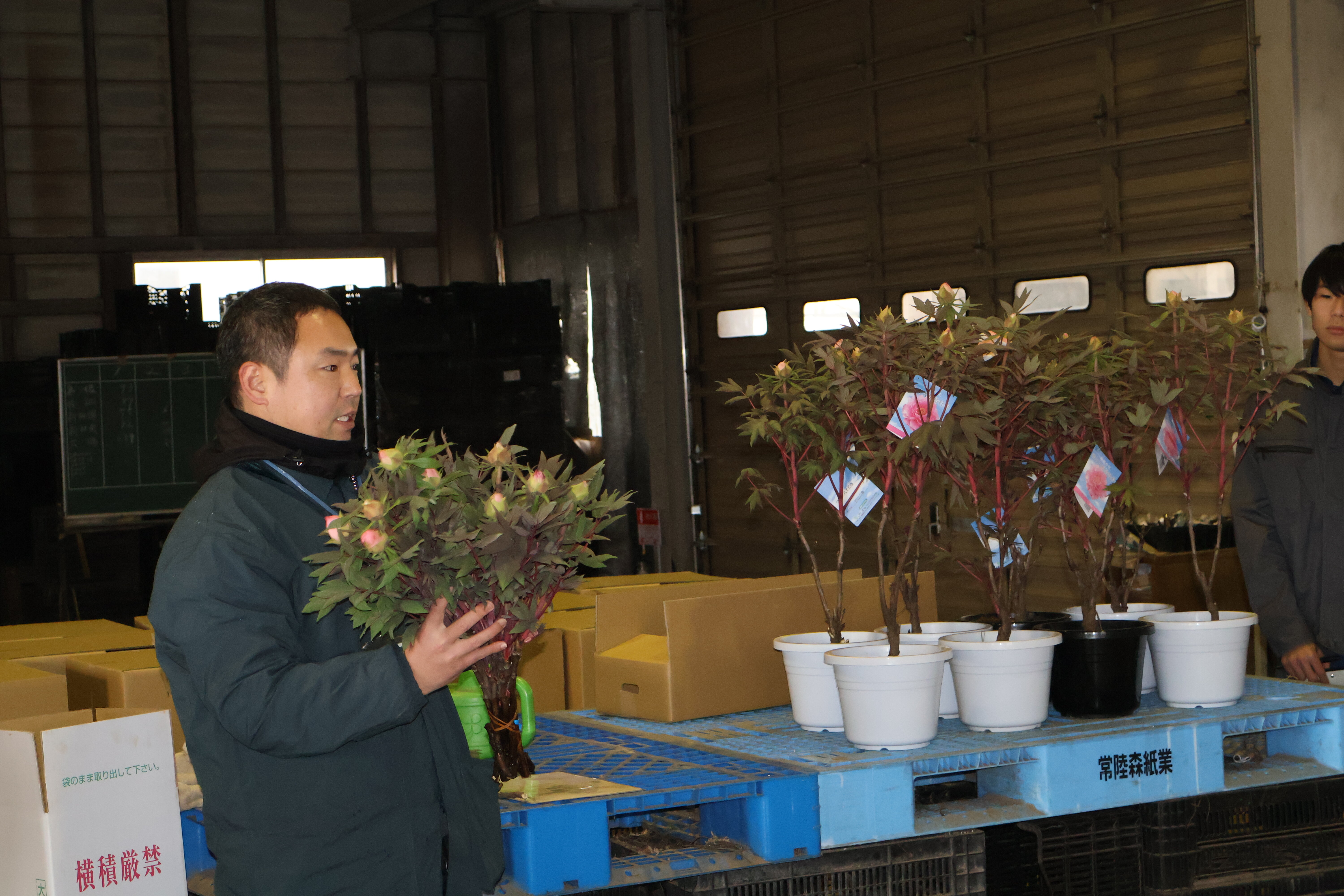 生物生産科です。草花コース、植物バイオコースの人たちが八束町でボタンの出荷の準備の様子を見学しました。八束町のボタンの生産は日本一を誇っています。ボタンを切り花、鉢花として全国各地、海外へ出荷するさいのポイントを勉強しました。無事トラックが市場へ到着できるようそれぞれクッション材などを入れていることなどを実演を交えて教えていただきました。ボタンの本来の開花は5月ですが、早く出荷するための工夫などもあわせて教えていただきました。生産者の思いが消費者の皆さんに伝わるようとてもていねいな仕事を心がけていることを教えていただきました。農家さん、JAの皆様、県・市の担当者の皆様ありがとうございました。