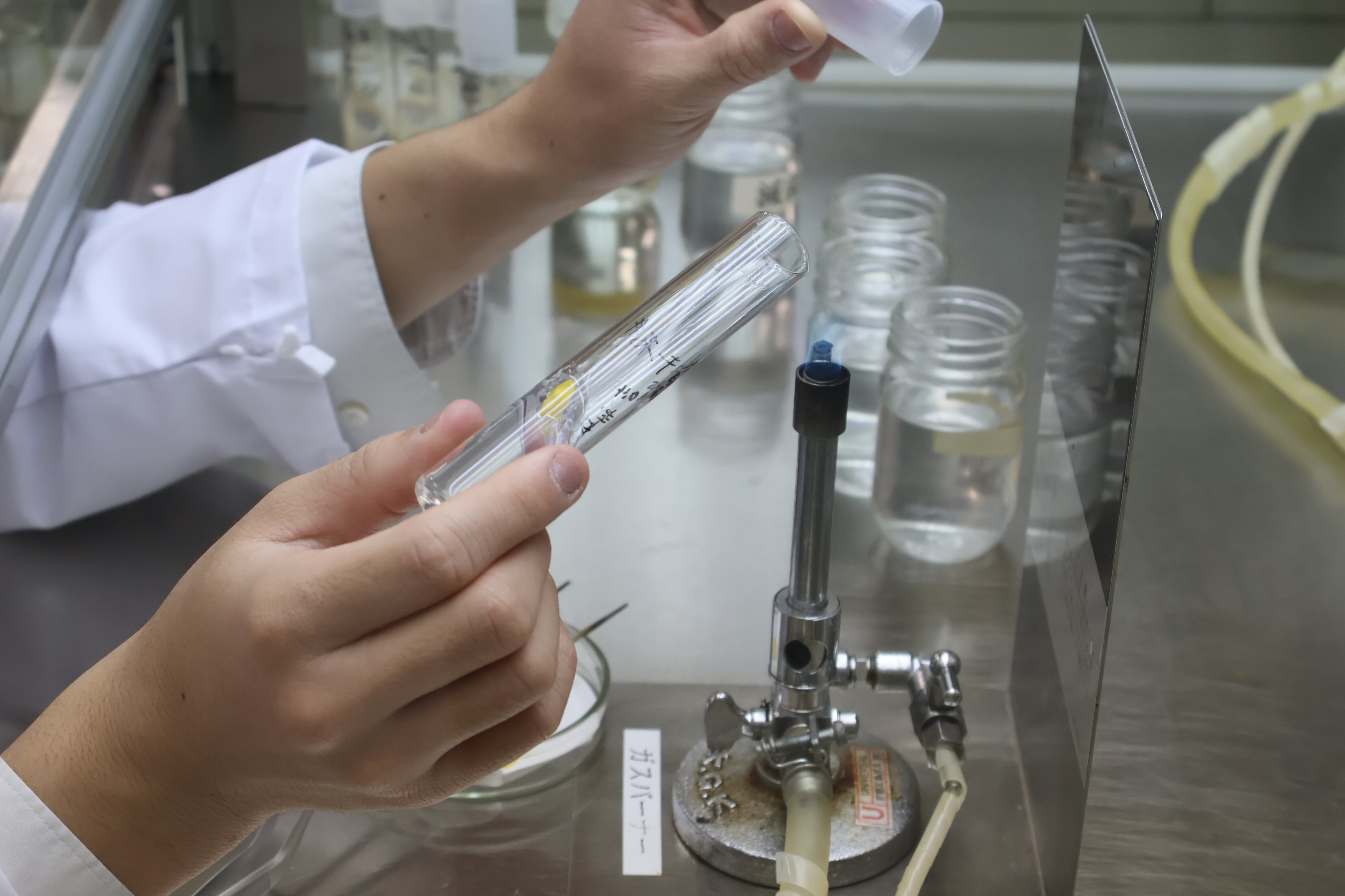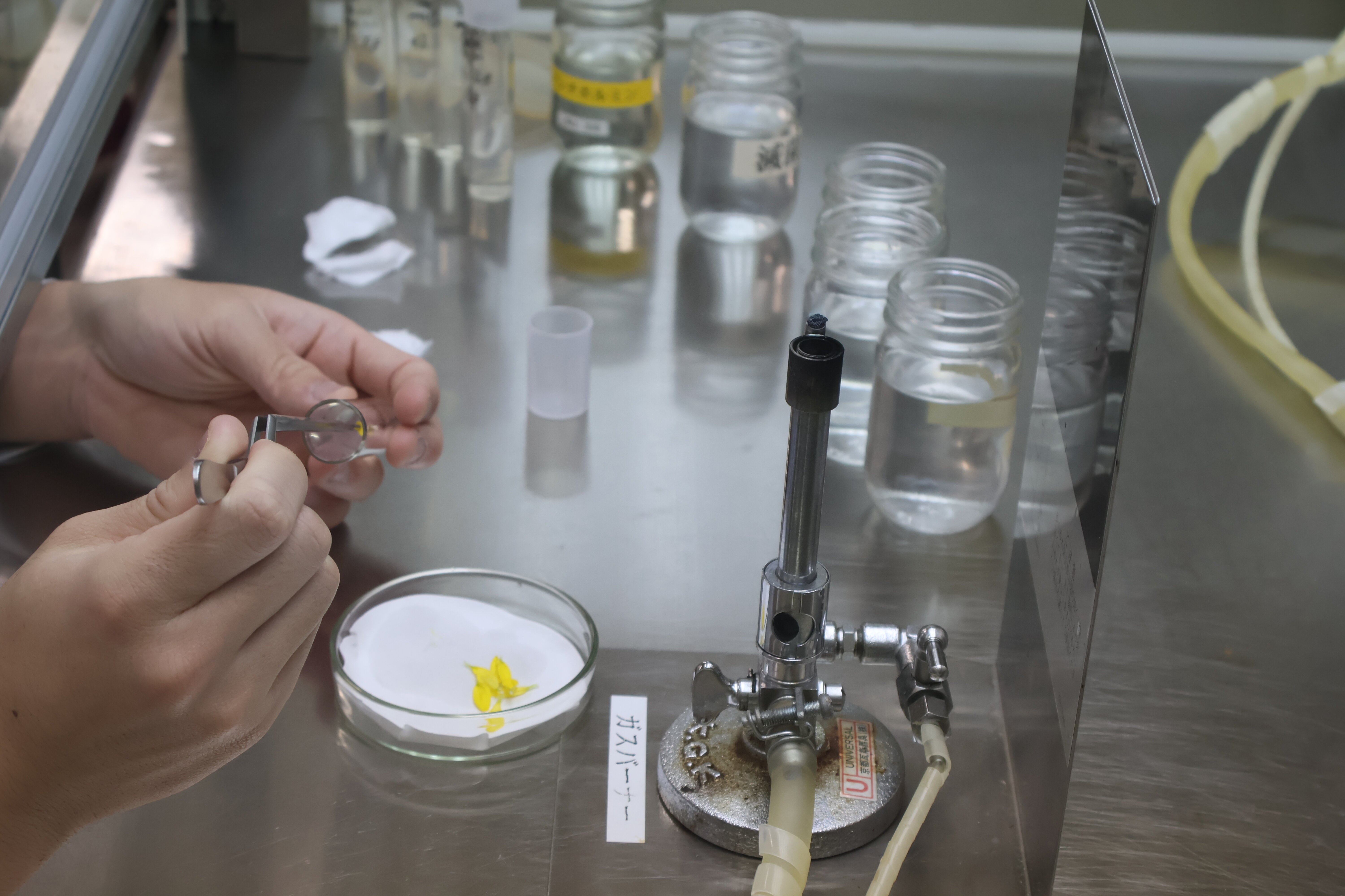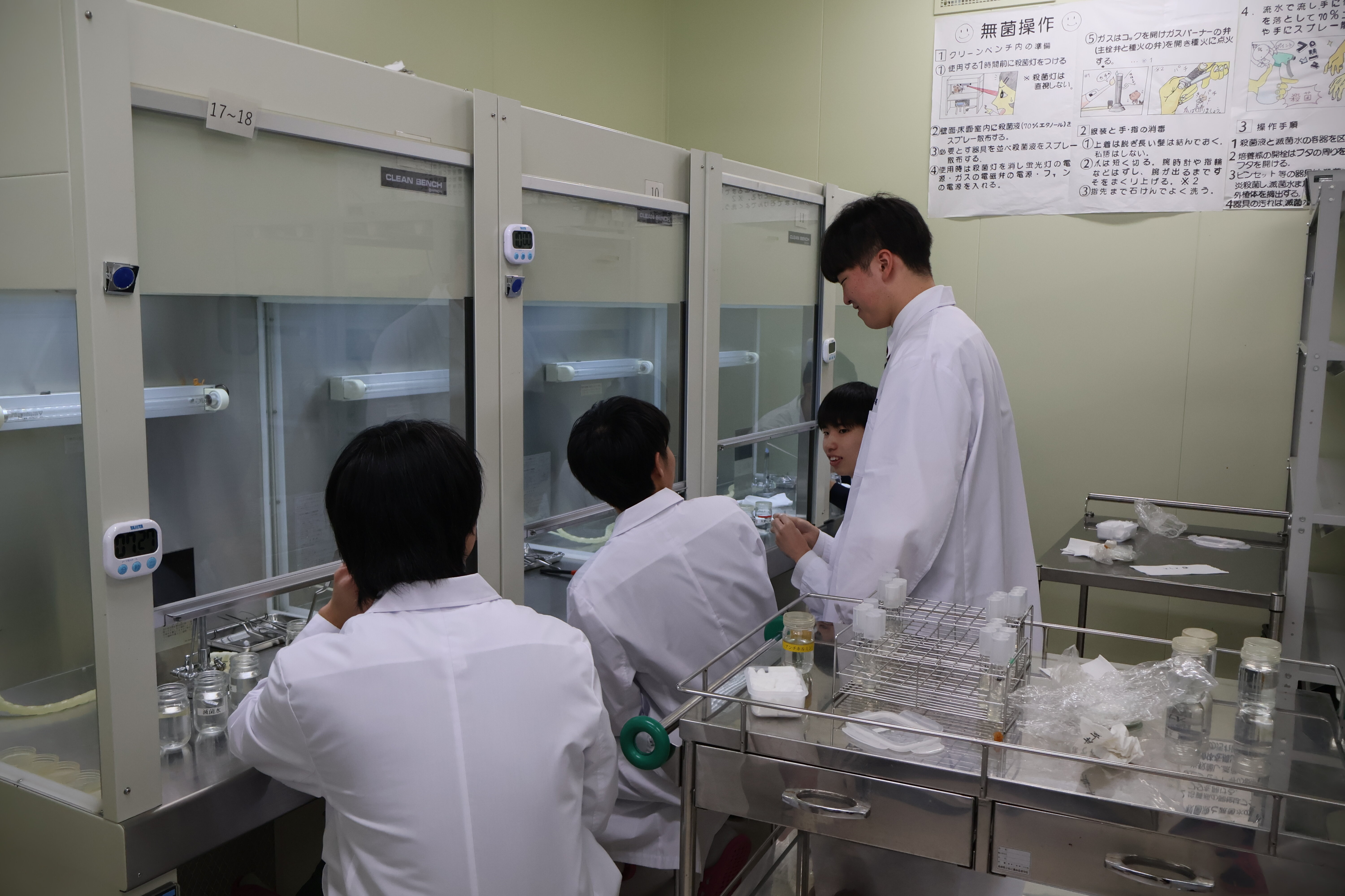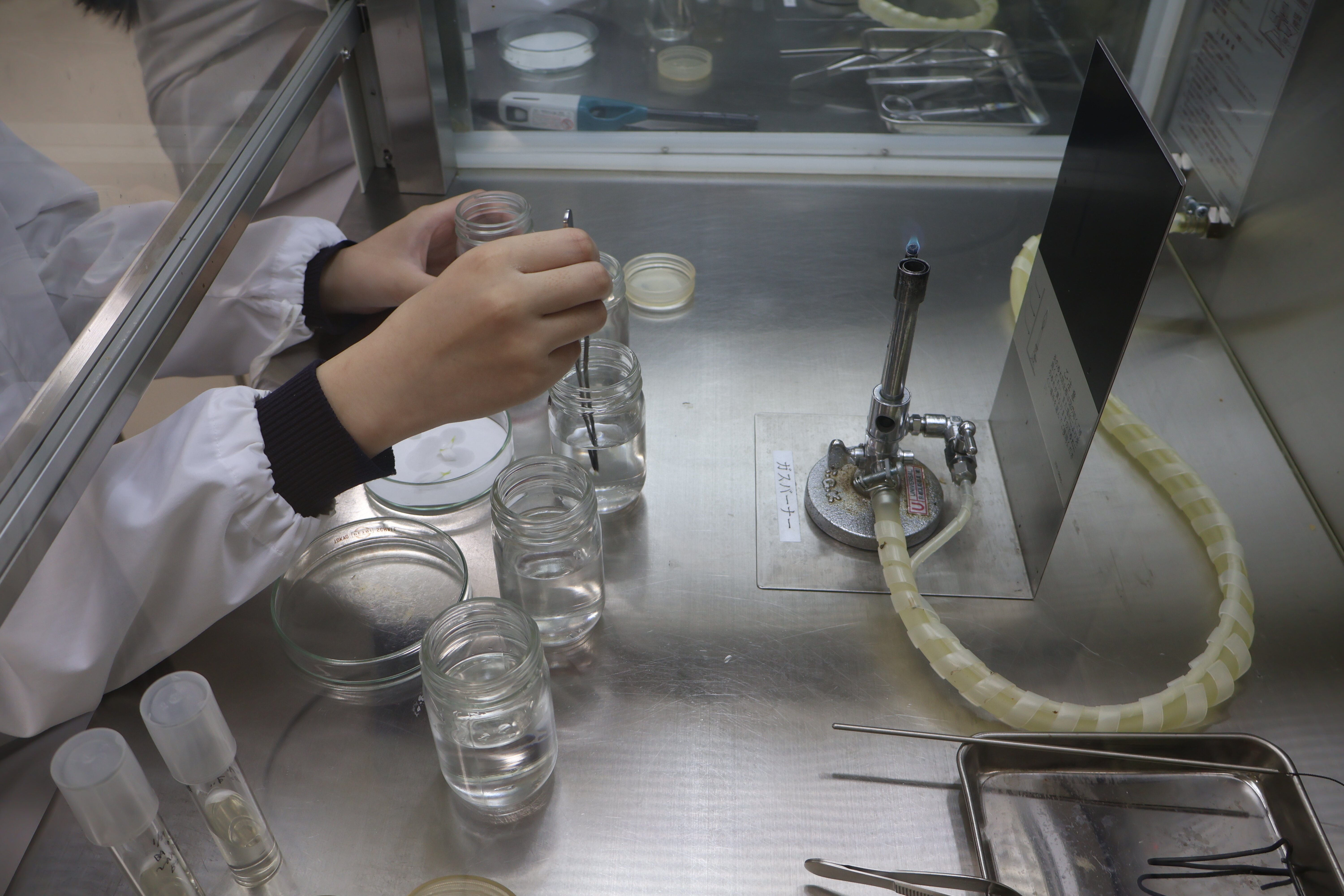 授業風景 カテゴリ: 【クラウドファンディング】 いじめ防止基本方針 お知らせ イベント グランドデザイン 中学生の皆様へ 収穫祭 各種支援金・大阪学生会館 各種証明書、他 図書館 学校経営方針 授業風景 特別支援教育 行事予定 進路指導部 部活動 2026. 01.29 キクの花びらの培養 生物生産科植物バイオコースです。キクの花びら(花弁)一枚を培養する実験を行いました。殺菌などの手順の後、培養すると花びら一枚から元の植物体に戻ることを学びました。植物の生命のたくみさを勉強しました。この実験は、試験管の培地にキクの花びらを置くだけですが、培地の成分をしっかりと勉強してから行いますのでかなり高度な実験です。 キクの花びらを採取 殺菌液で殺菌 すすぐ 試験管に置きます。 協力し合って実験します。 花びら一枚からもとの植物体に戻ります。 前に戻る