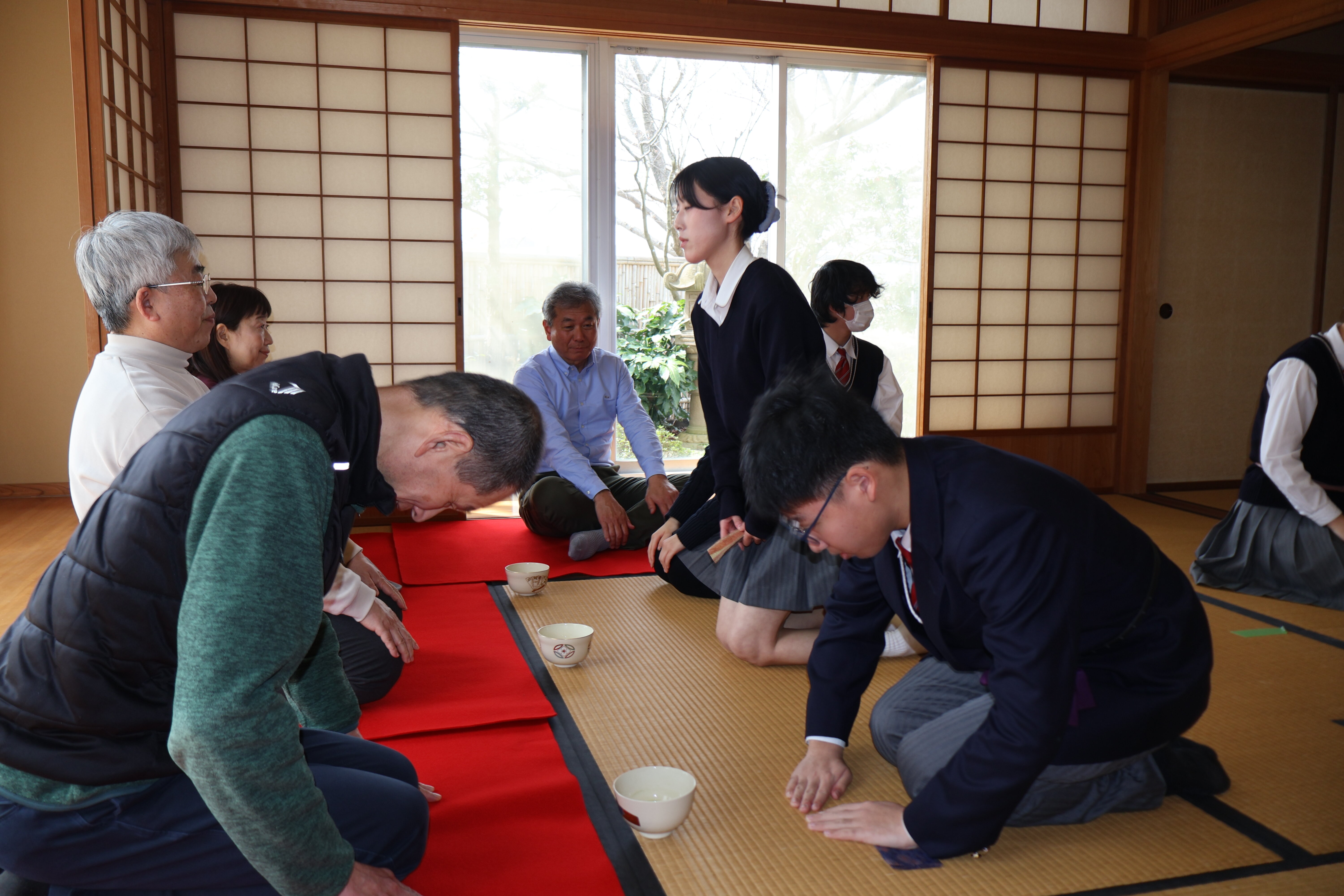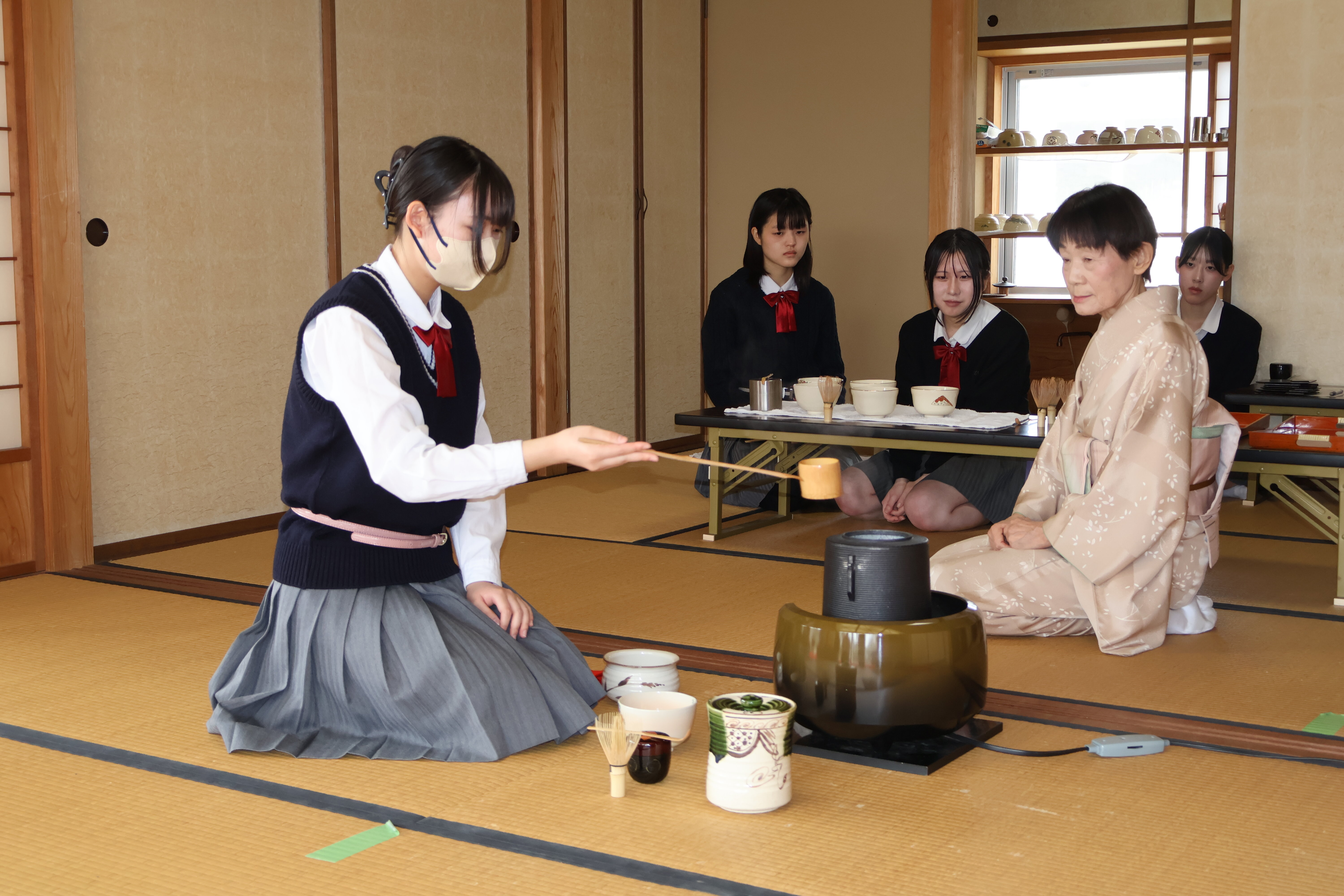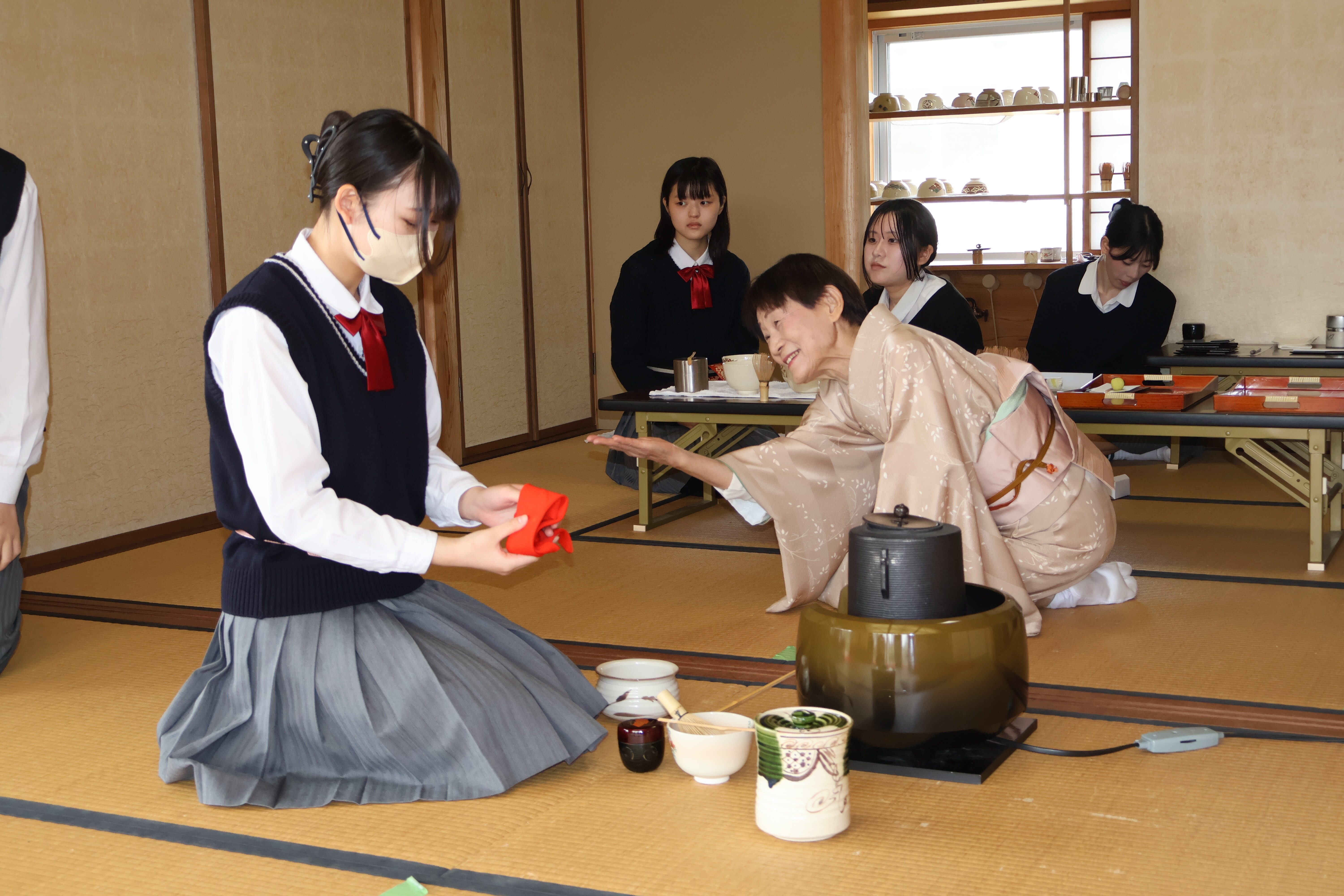 終業式の午後、茶道部の茶会がありました。教職員を前に、講師の先生の手取り足取りで、お茶碗に抹茶とお湯を入れて点てる、点てたお茶をお客様に差し出すなどの一連の作法を披露していただきました。生徒、教職員ともに日本の侘び寂び文化に触れ、心を落ち着けることができた、心温まるひとときでした。
