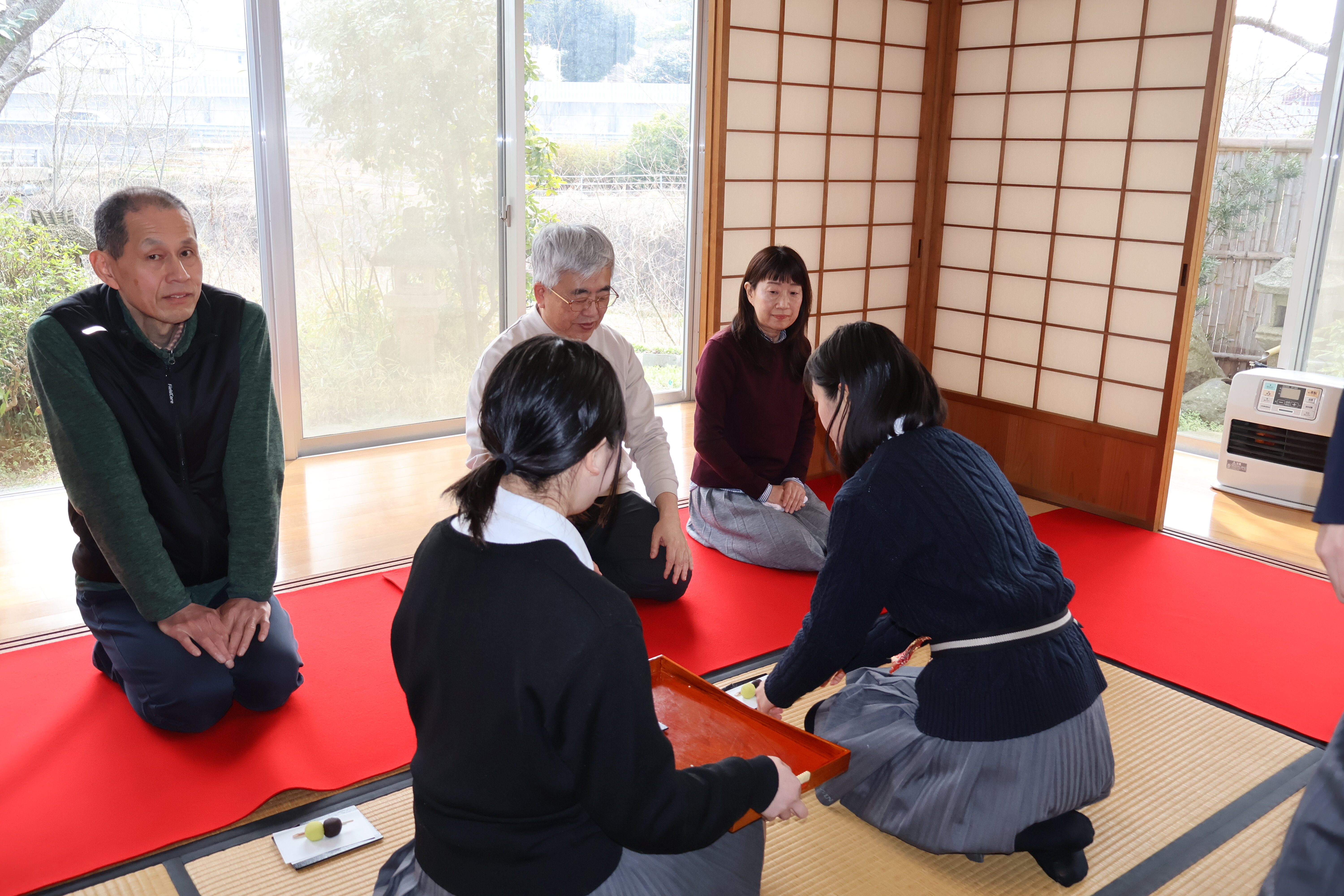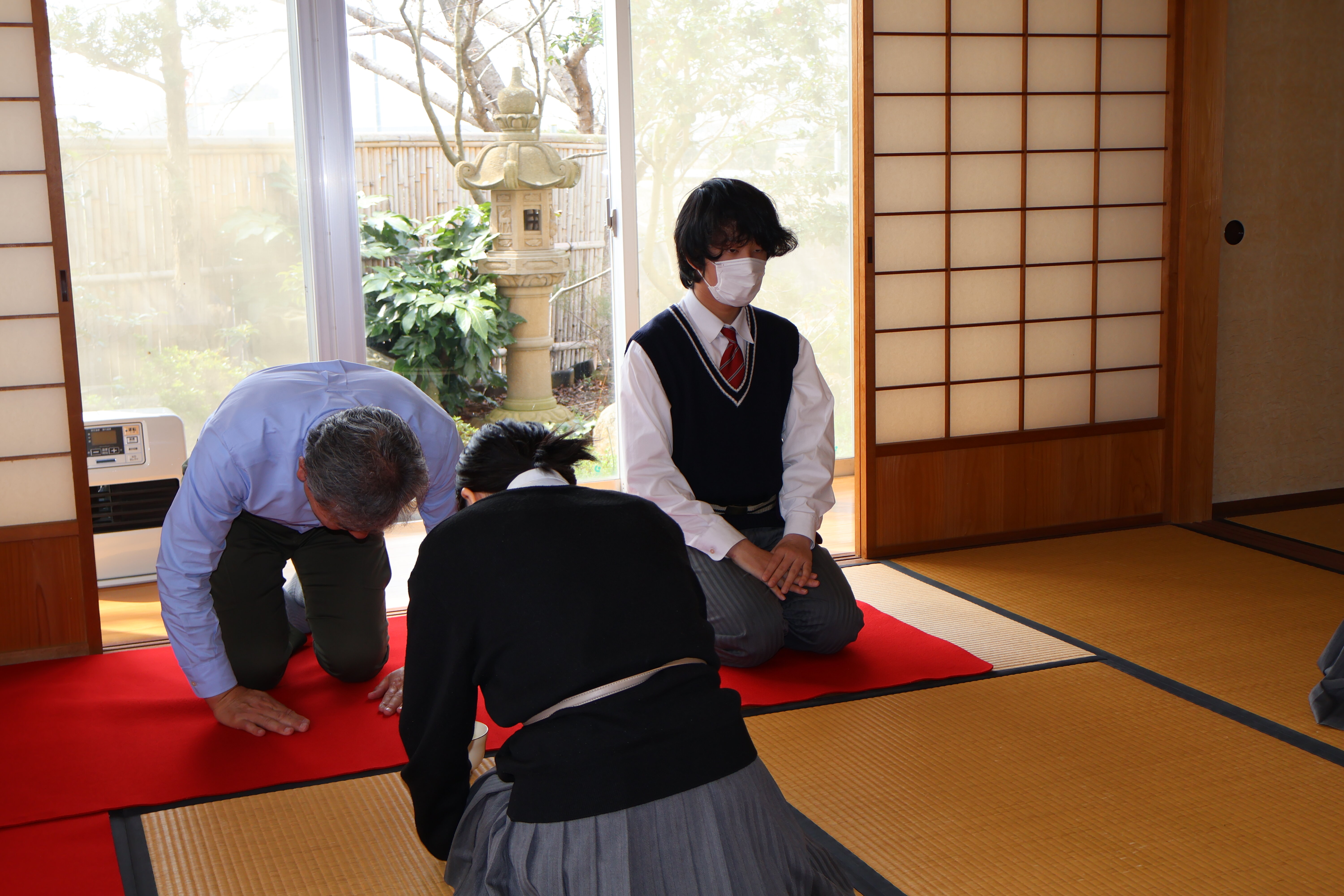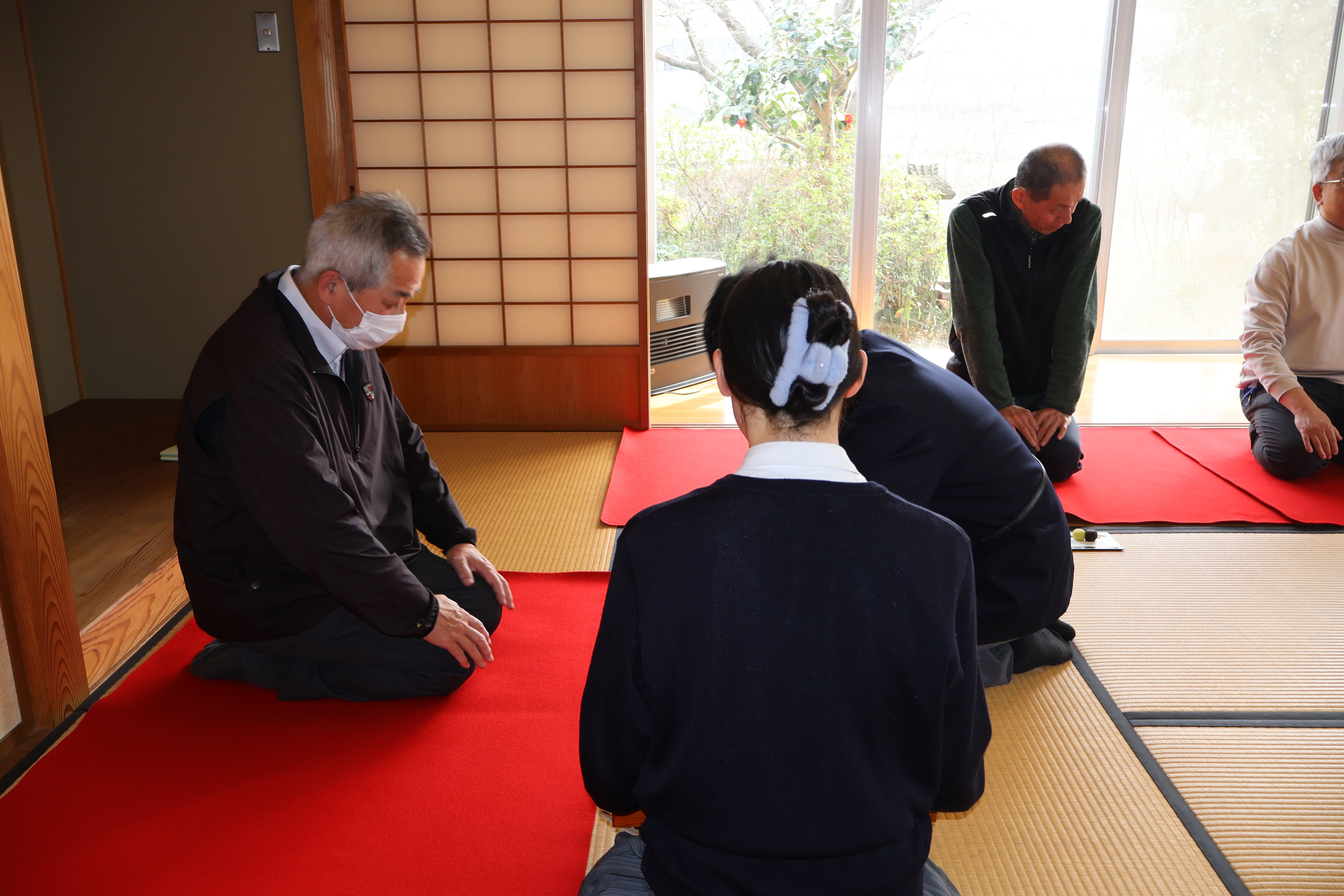終業式の午後、茶道部の茶会がありました。教職員を前に、講師の先生の手取り足取りで、お茶碗に抹茶とお湯を入れて点てる、点てたお茶をお客様に差し出すなどの一連の作法を披露していただきました。生徒、教職員ともに日本の侘び寂び文化に触れ、心を落ち着けることができた、心温まるひとときでした。